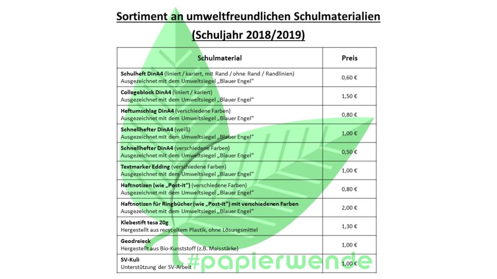 Seit vielen Jahren gibt es an unserer Schule in einzelnen großen Pausen einen kleinen Verkaufsstand, an dem alles, was ein Schülerherz so begehrt, aus recycelbarem Papier erworben werden kann. Unser bestehendes Sortiment wurde nun den Schülerwünschen angepasst und durch weitere Papierprodukte sowie Produkte aus Bioplastik, bzw. recyceltem Plastik erweitert.