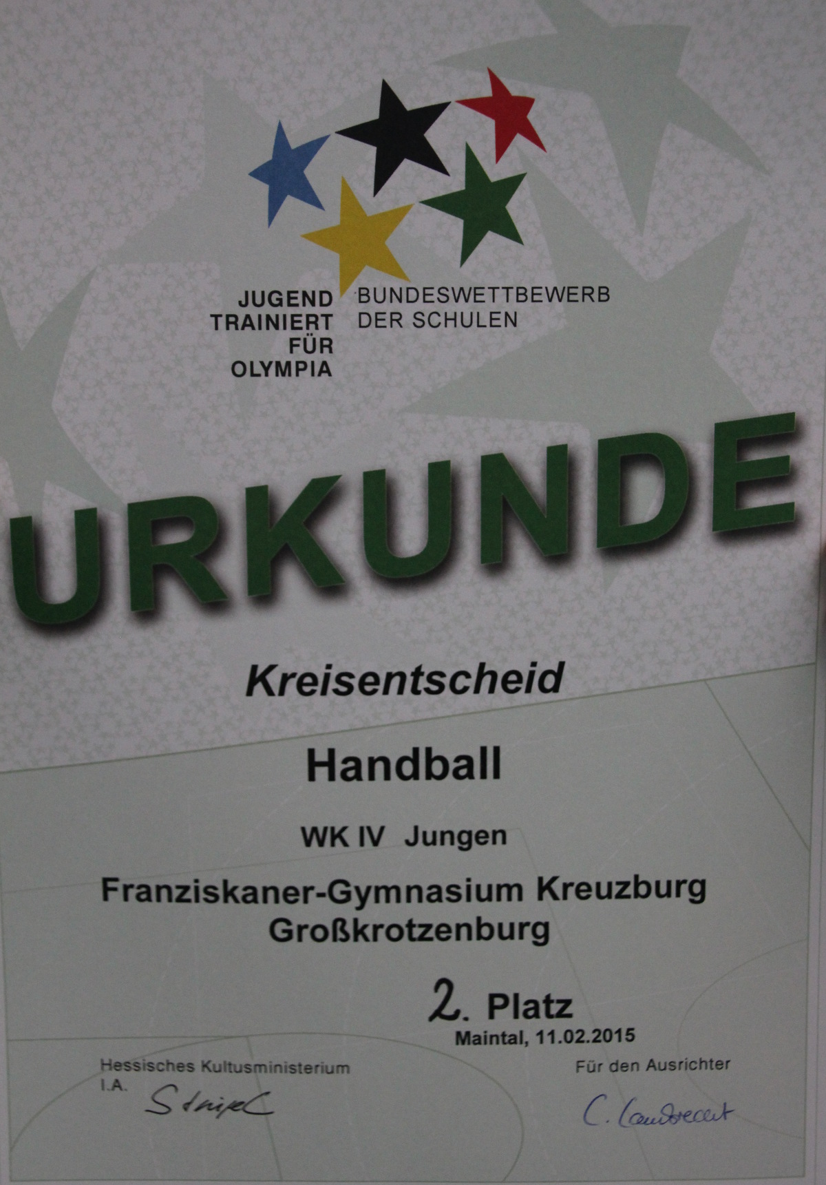 Beim Kreisentscheid Handball WK IV (Jg. 2002 und jünger) in Maintal erzielte unser Team den 2. Platz. Insgesamt traten fünf Mannschaften in dieser Kategorie an. Das Endspiel gegen die Karl-Rehbein-Schule ging leider knapp verloren, da die Gruppe aufgrund des schlechteren Abschneidens im Vielseitigkeitswettbewerb mit 0:2 ins Spiel startete.