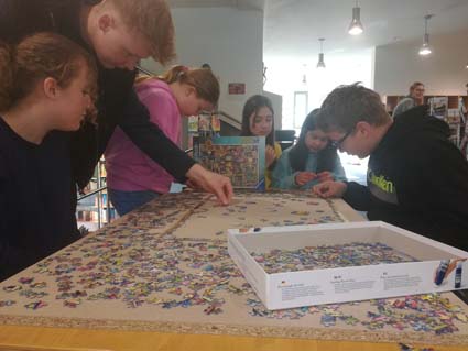 Als Jubiläumsaktion fügen Schülerinnen und Schüler im Moment das aus 1.000 Teilen bestehende Puzzle „Magisches Bücherregal Nr. 2“ zusammen, das später aufgeklebt und an die Wand neben das bereits fertiggestellte Puzzle „Magisches Bücherregal Nr. 1“ gehängt wird.