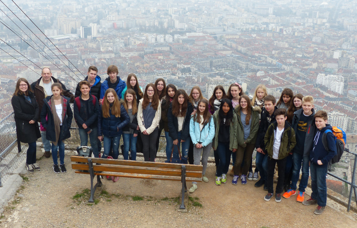 Vom 19.3. bis zum 26.3. waren in diesem Jubiläumsjahr 23 Schüler und Schülerinnen der Klassen 7 und 8 zu Gast bei Austauschfamilien in der Nähe von Grenoble. Schon in der Vorbereitung der Fahrt war zu spüren, dass dies ein besonderer Besuch werden würde. So sollten der Text der Europahymne, ein Lied zum Austausch und Tanzschritte für einen „Flash-Mob“ schon vor Abfahrt gelernt sein. Die Fahrt begann wie üblich mit fast 10 Stunden Bustransfer nach Grenoble, wo wir am Parkplatz der Schule von freudig gespannten Schülern, Eltern und Lehrern herzlich in Empfang genommen wurden. Viele Menschen, darunter auch zahlreiche vertraute Gesichter, hatten sich zu unserer Begrüßung eingefunden. Herzliche Umarmungen von Freunden und zaghafte Annäherungen zukünftiger Freunde.
