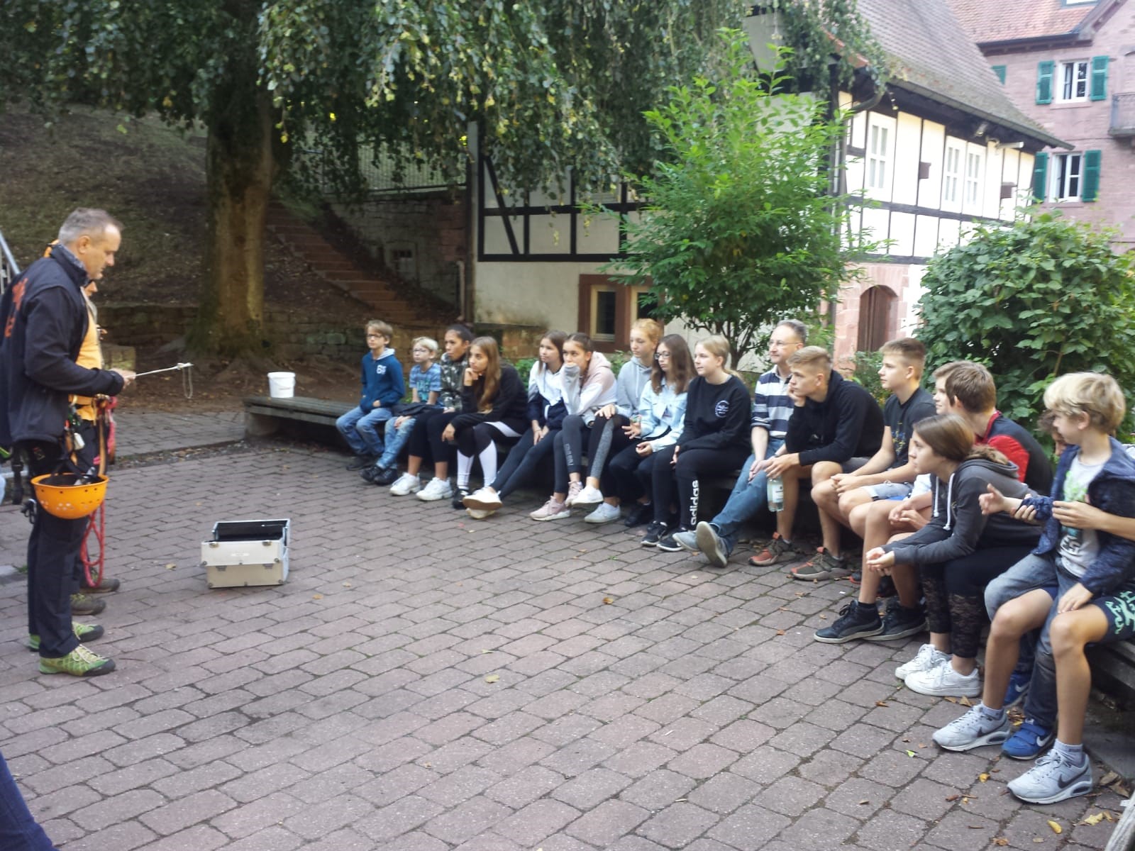 uns an der Kletterwand und den acht Hochseilelementen in die Höhe wagten. Währenddessen brachen unsere Eltern zu einem Spaziergang auf und erkundeten unter fachmännischer Anleitung eines Vaters, der Hobby-Fischer ist, das Leben von Fischen, Flusskrebsen, Köcher- und Eintagsfliegen sowie allerlei anderen Bewohnern des Flüsschens Elsava. Die freie Zeit zwischen Mittagessen und Kaffeepause bot Gelegenheit zum Chillen, Basketballspielen, Lesen oder für individuelle Aktivitäten.