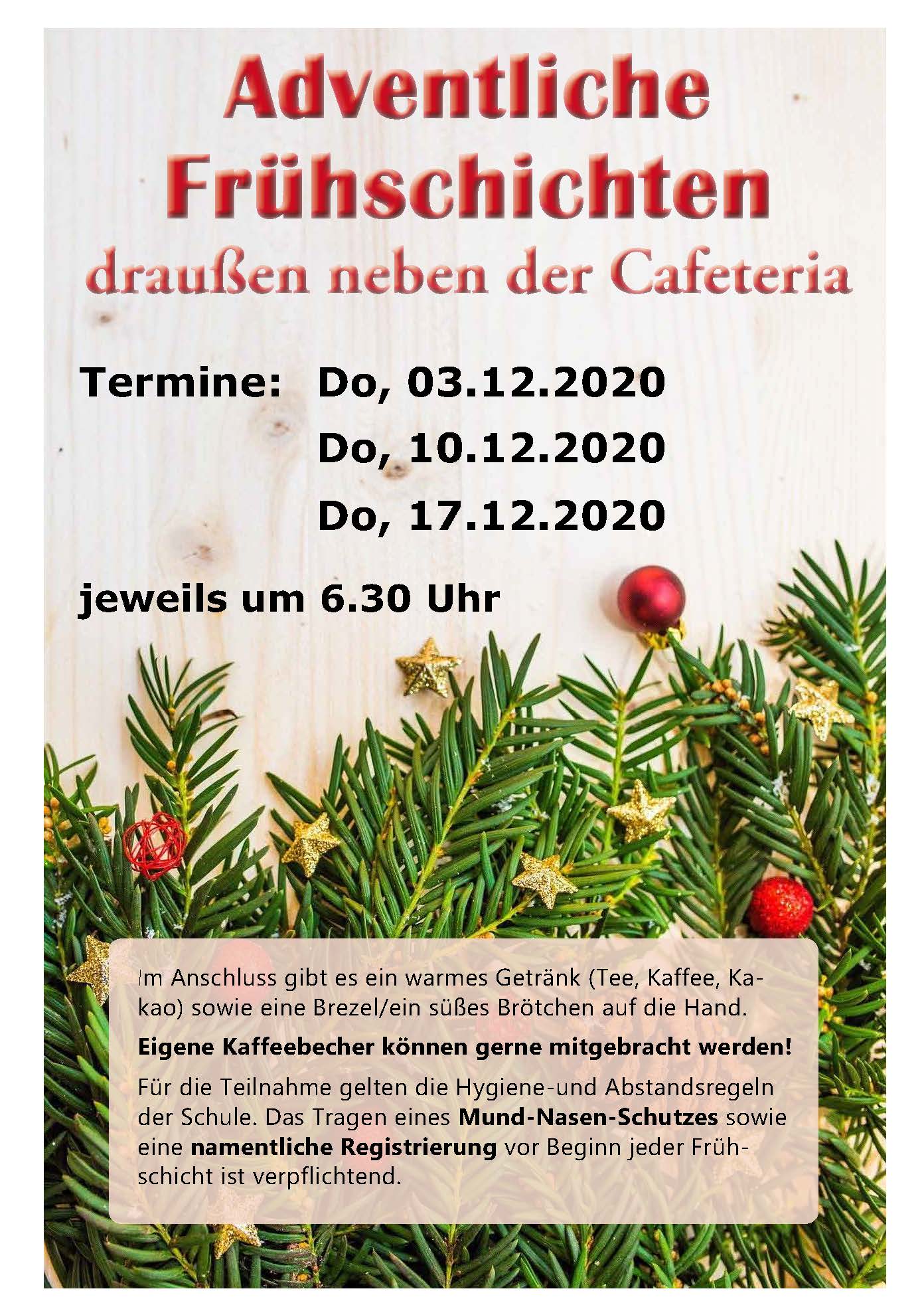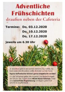 In diesem Jahr finden die adventlichen Frühschichten aus gegebenem Anlass im Freien neben der Cafeteria statt. Schülerinnen und Schüler sowie Lehrkräfte sind herzlich eingeladen jeweils donnerstags am 3., 10. und 17. Dezember 2020 um 6.30 Uhr teilzunehmen.