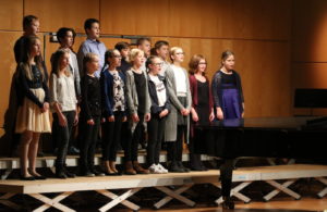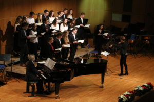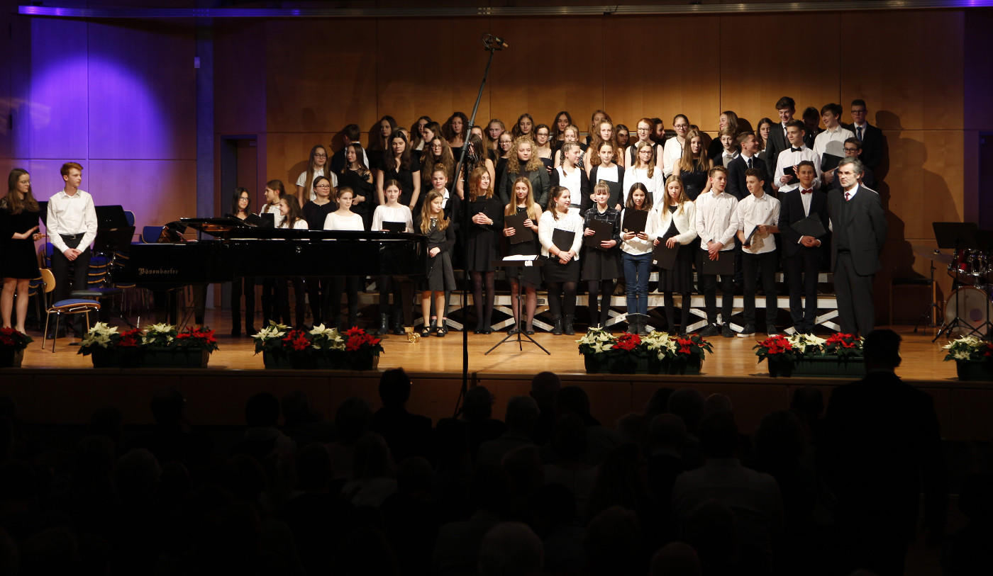 Diesen beiden Instrumentalensembles schlossen sich die Beiträge von drei Chören der Schule an. Zunächst erklangen drei „Neue geistliche Lieder“ zur Weihnachtszeit, zwei auf Texte von Eugen Eckert („Diese Nacht hat ein Geheimnis“, Musik: Robert Haas und „Wo immer ein Mensch“, Musik: Alejandro Veciana) und „Jesus Christus ist das Licht“ von Anselm Thissen nach einem Text von Thorsten