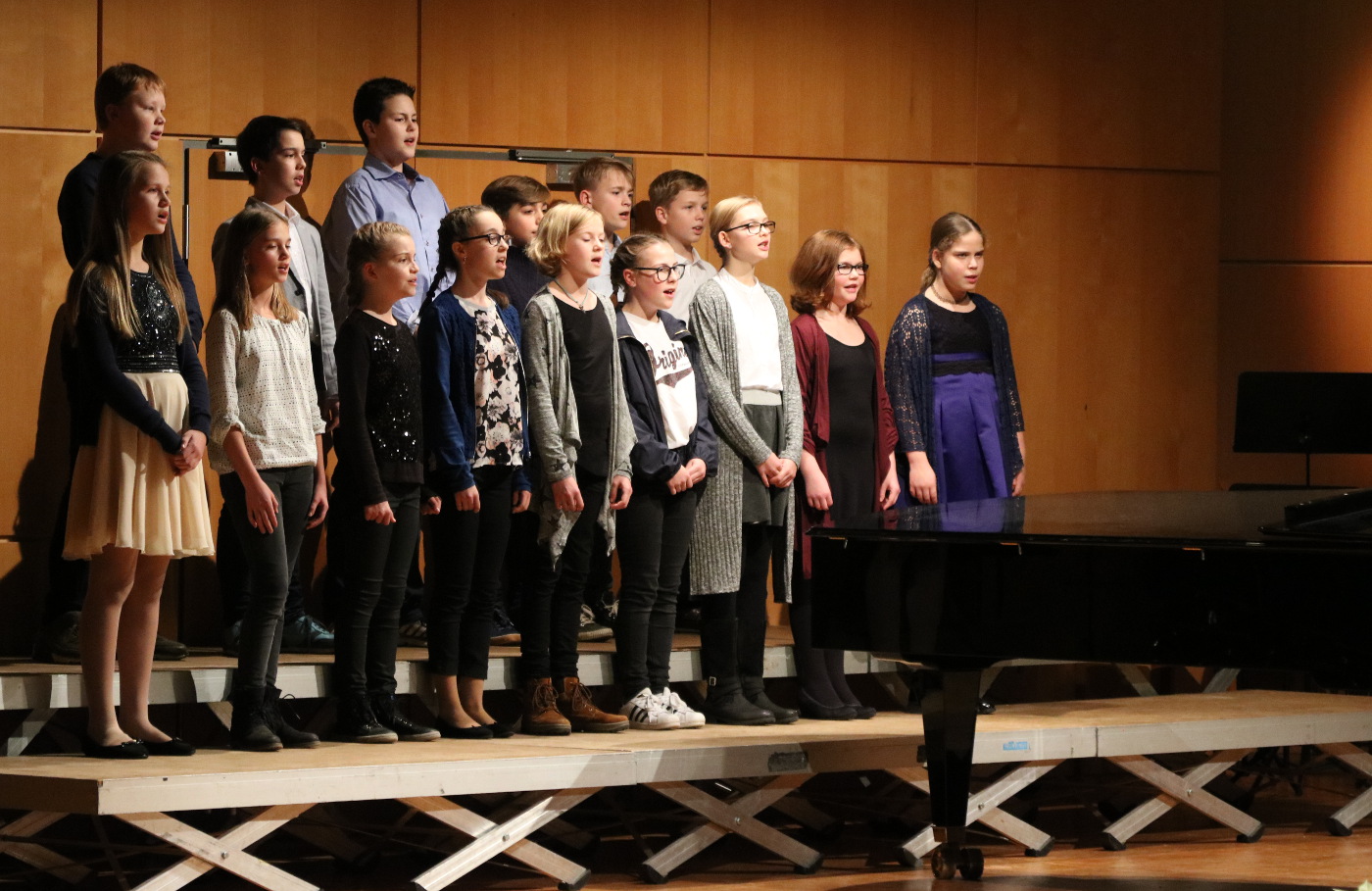Chor der 6. Jahrgangsstufe schloss sich mit drei deutschen Weihnachtsliedern an: Dem bekannten und beliebten „Stern über Bethlehem“ von Alfred Zoller, dem alten Volkslied „O Tannenbaum, o Tannenbaum, du trägst ein‘ grünen Zweig“ und dem vielen von den „Sternsingern“ wohlvertrauten „Wir kommen daher aus dem Morgenland“ von Heinrich Rohr und Maria Ferschl. Mit „Take a Winter Walk with Me“ von Mary Donnelly wandte sich