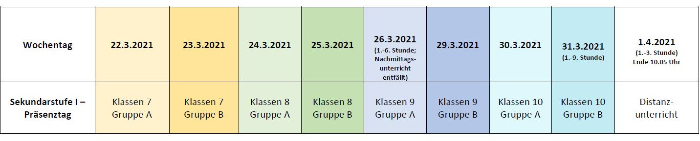 Dieser wird als eingeschränkter Regelbetrieb unter Einhaltung der bekannten Hygienebestimmungen durchgeführt. - Auch die Jahrgangsstufen ab Jahrgangsstufe 7 kehren in den täglichen Präsenzunterricht (eingeschränkter Regelbetrieb) zurück. Das heißt, alle Jahrgangsstufen von 1 bis 13 befinden sich wieder im Präsenzunterricht.