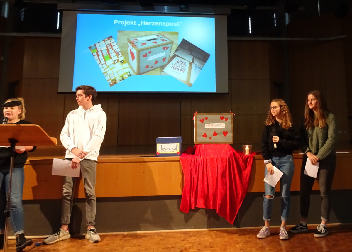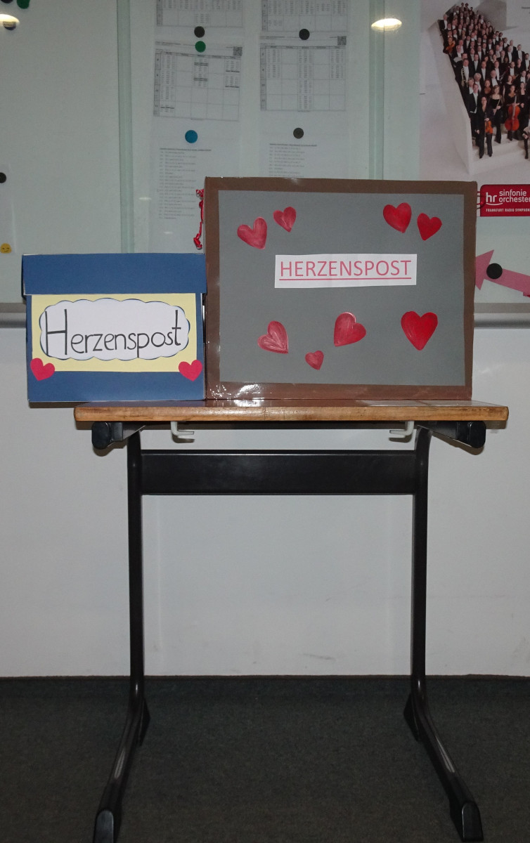 >„Wir, die Klasse 9d, stellen euch heute ein ganz besonderes Projekt namens ‚Herzenspost‘ vor. Dieses Projekt stammt von Antonia Papenfuhs, die dieses Jahr ihr Abi bestanden hat. Die Idee dazu bekam sie, als sie durch Frankfurt lief. Ihr fiel die Hilflosigkeit und Einsamkeit der Obdachlosen auf, die am Straßenrand saßen. So ging es ihr ebenfalls, als sie ältere Menschen sah. Sie widmet also dieses Projekt den Menschen, die oft nicht viel Aufmerksamkeit bekommen und am Rande der Gesellschaft stehen.“