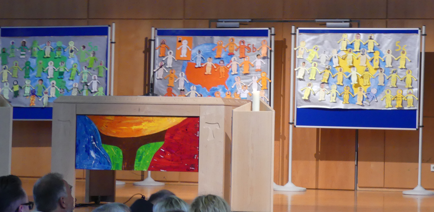 die durch uns zusammenhält“ wurden sie in die Schulgemeinde aufgenommen. Für jede Klasse stand eine Pinwand bereit, auf der den Klassen jeweils ein Erdteil zugeteilt worden war. Dieser soll sie in den nächsten Jahren begleiten in der Hoffnung, dass in der einen oder anderen Klasse ein Projekt daraus entsteht, in dem die Schülerinnen und Schüler Verantwortung – beispielsweise mit einer Patenschaft – übernehmen. Die Schülerinnen und Schüler wurden eingeladen, eine von ihnen mitgebrachte Papierfigur in der Klassenfarbe auf der Pinwand mit ihrem Erdteil anzubringen. Die neuen Klassenlehrerinnen und -lehrer sowie die Schülerpatinnen und -paten aus der Jahrgangsstufe 11 halfen ihnen dabei.