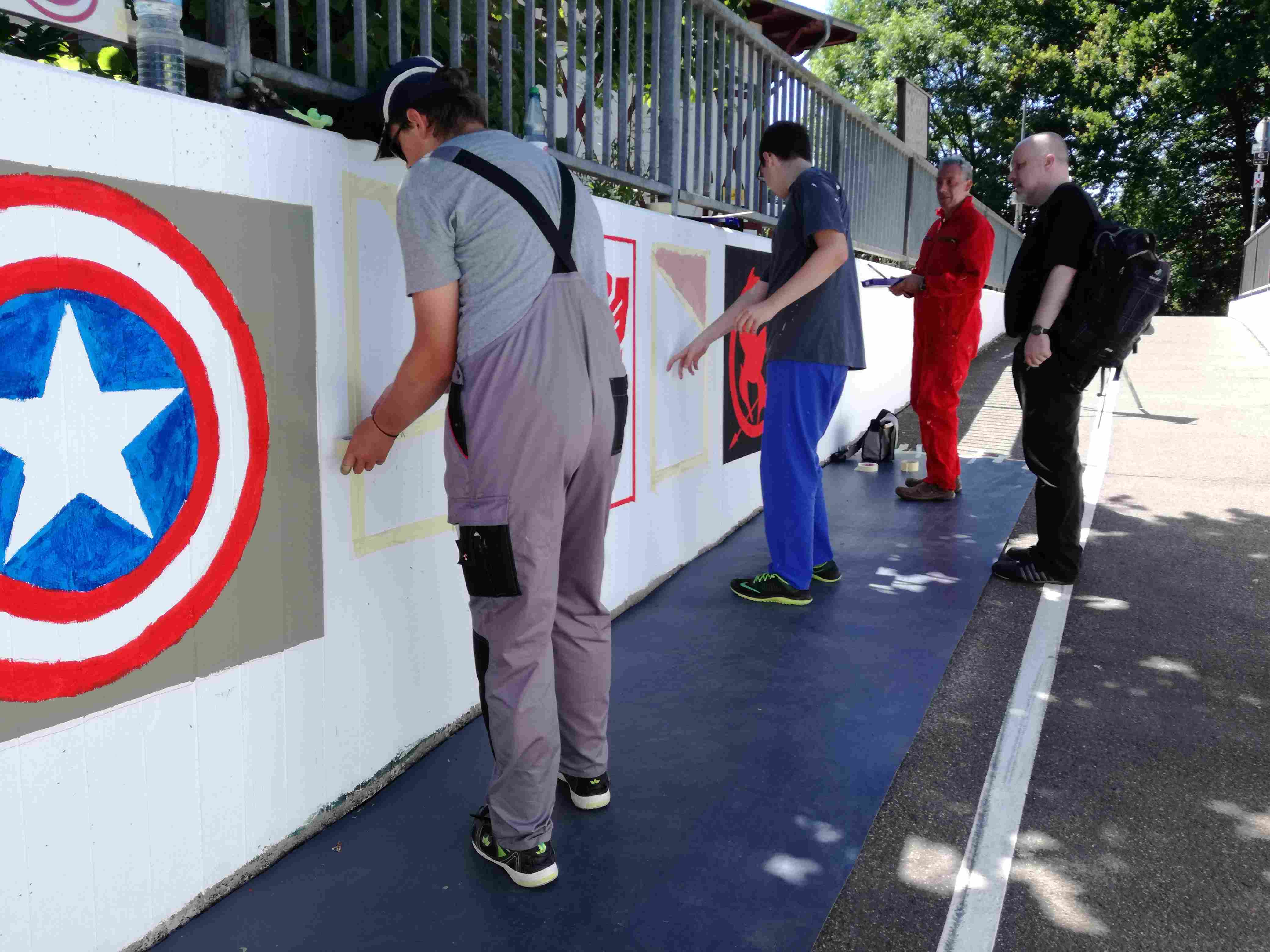 Aufgrund der hoch sommerlichen Temperaturen war das Bemalen der Unterführung eine große Herausforderung an alle Beteiligten. Trotzdem konnten die Arbeiten im Zeitplan zu Ende geführt werden. Nachdem am Donnerstag alle Motive an den Wänden fertig gestellt waren, wurden am Freitag zum Abschluss noch die Treppenaufgänge mit Streifen verziert. .
