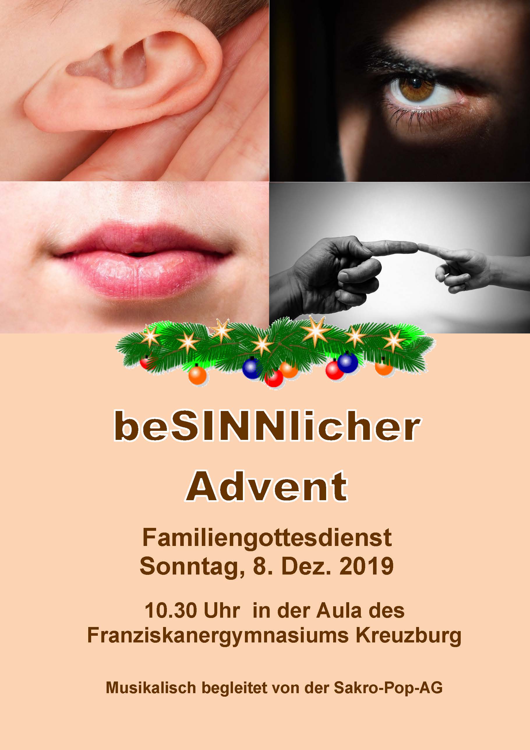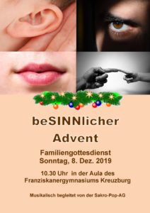 Vor einem Jahr standen die Montagsimpulse im Advent schon einmal unter dem Thema: „beSINNlicher Advent“. Jede Woche versuchten wir damals, einen unserer Sinne zu schärfen. Seitdem ist viel geschehen. Es bedarf einer Auffrischung. So feiern wir einen Adventsgottesdienst für „alle Sinne“. Feiern Sie mit uns!Die Sakro-Pop-AG wird uns wieder mit ihrer Musik begleiten.