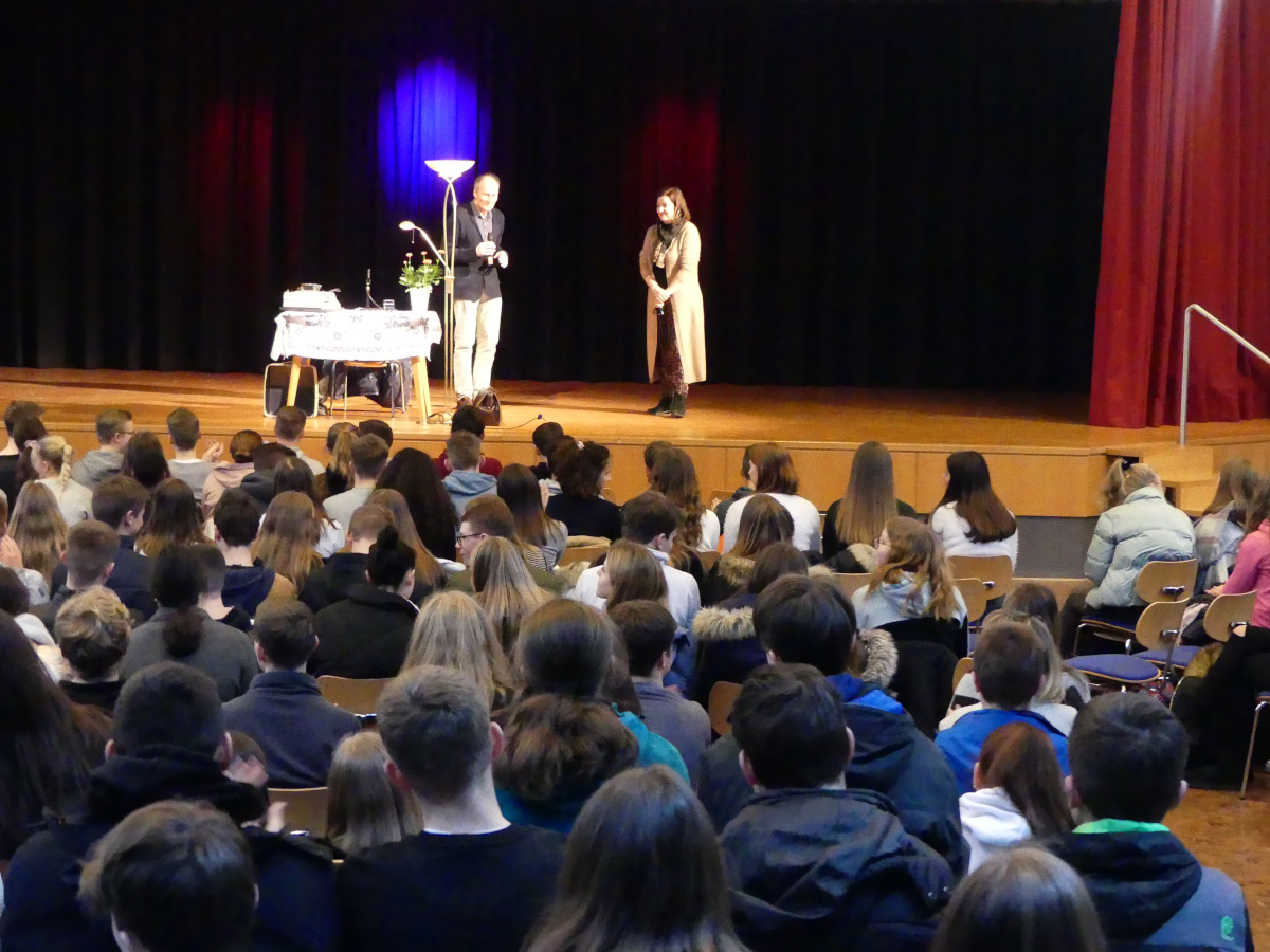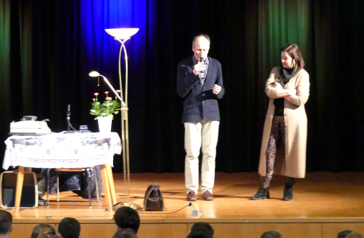 Als sie an einem liebevoll dekorierten Tisch auf der Aulabühne Platz nahm, wirkte sie erst etwas kühl und distanziert; aber sobald sie zentrale Handlungselemente aus „Tannöd“ zu lesen begann – mit jeweils anderer Rollenstimme und kräftig bayerischen Idiom -, da war sie ganz in ihrem Element. Und als sie am Ende auf die zahlreichen Publikumsfragen einging, war sie endgültig ganz nah bei ihren Zuhörern.