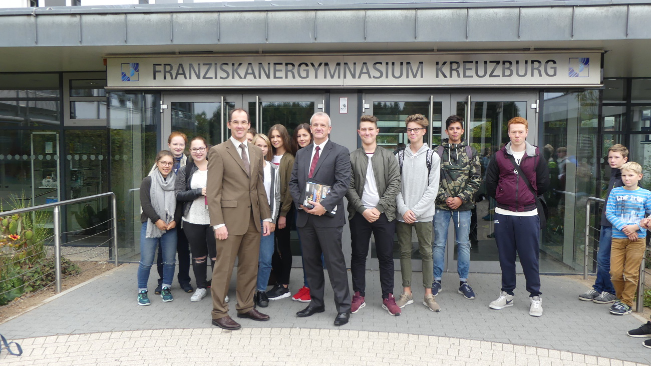 Thorsten Bauroth, Bürgermeister von Großkrotzenburg, war zu Gast an unserer Schule. Nach einem ersten Vorstellungsbesuch nach seinem Amtsantritt nutzte er nun einen Schulrundgang, um das Gymnasium besser kennen zu lernen. In einem anschließenden Gespräch mit der Schulleitung und Geschäftsführung ging es um den Austausch über Themen wie den öffentlichen Nahverkehr, die gemeinsame Nutzung von Infrastruktur und die Unterstützung der Gemeinde bei der Romfahrt der Schule zum Jubiläum.
