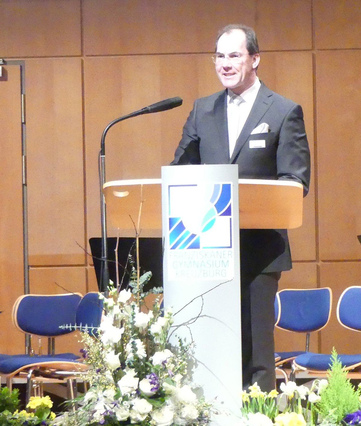 Auch Kultusminister Prof. Dr. R. Alexander Lorz sah das Spezielle einer christlichen Erziehung in der Weitergabe von besonderen Werten. Er führte hierzu die Leitlinien des Franziskanergymnasiums an, in denen er solche Werte festgehalten sieht. Eines der wichtigsten Elemente ist dabei für ihn das Erleben der Gemeinschaft. Lorz zog einen Vergleich zu Franziskus, der sehr authentisch gemäß seinen Grundsätzen lebte und dadurch so überzeugend war. Auch heute gelte, nur diejenigen können überzeugend sein, die solche Werte auch selber leben.