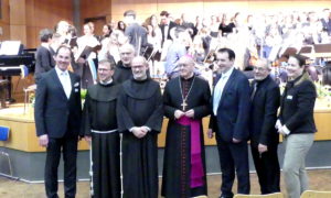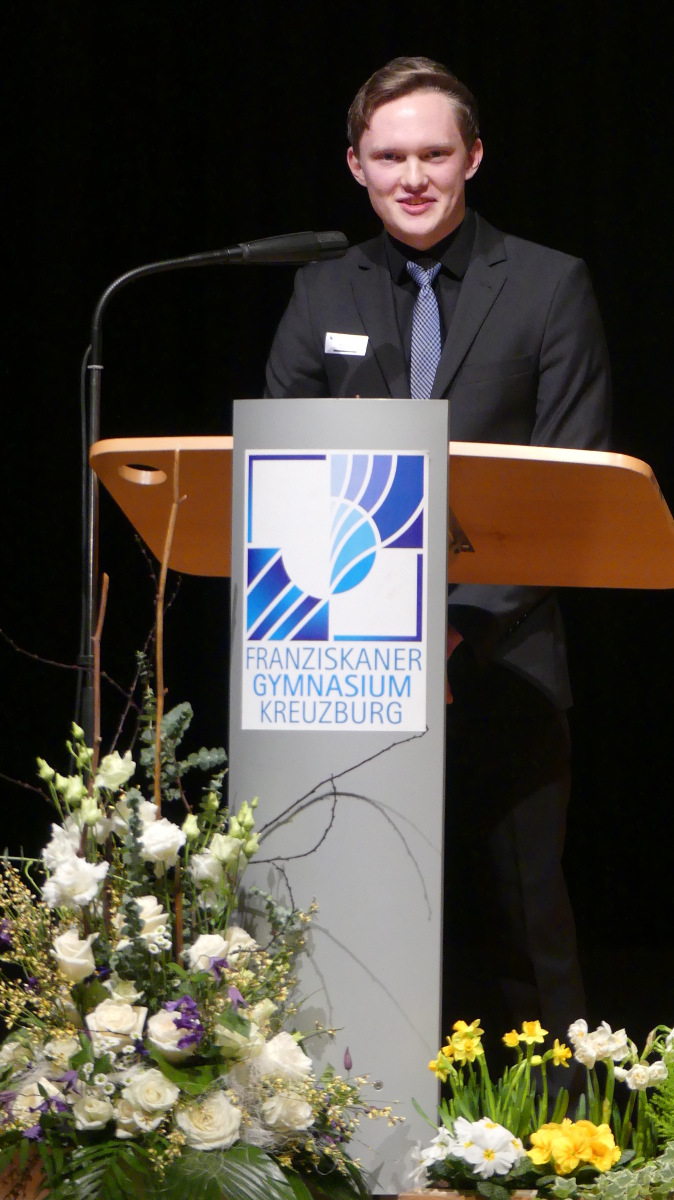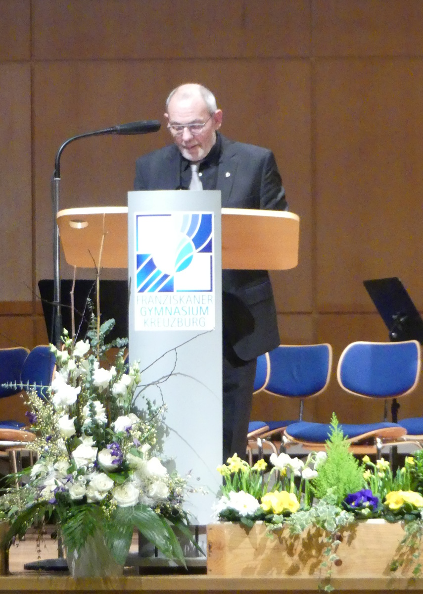 Pater Prof. Dr. Udo Schmälzle, Geschäftsführer der Franziskanergymnasium Kreuzburg gGmbH dankte allen Beteiligten des Abends, darunter die beiden Schulsprecher, Anna Scholl und Benedikt Dey, die als Moderatoren galant durch den Abend führten. Zudem auch dem Orchester und den Chören, die für einen festlichen musikalischen Rahmen sorgten. Mit einem großem Aufgebot an Schülern brachten sie mit großer Präzision unter Leitung von Dr. Maria-Elisabeth Heisler-Wiegelmann und Peter Loschert die beiden geistlichen Werke „Danke, danket dem Herrn“ und „Meine Seele erhebet den Herrn“ von Georg Philipp Telemann dar.