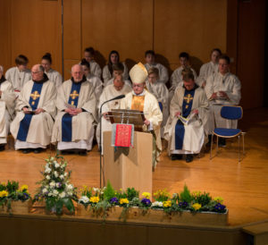 Eröffnet wurde die akademische Feier mit einem festlichen Pontifikalamt, musikalisch untermalt von der Sacro-Pop-Gruppe der Schule. In seiner Predigt ging der Fuldaer Bischof Heinz Josef Algermissen, der Frage der Besonderheit einer katholischen Schule nach. Neben der reinen Wissensvermittlung, erläuterte der Bischof, ist es ein Ziel „dem Menschen ─ unter Achtung seiner freien Entscheidung ─ zu helfen, ein Leben aus dem Glauben zu führen und sich in der Welt von heute als Christin und Christ zu bewähren.“