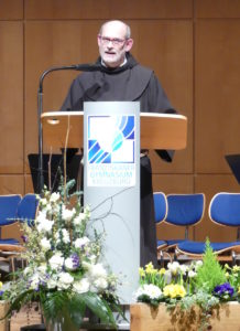 Vor 50 Jahren zog das Franziskanerkloster aus Watersleyde in Holland nach Großkrotzenburg in das Gebäude der Weißen Väter, die dort das Gymnasium Africanum geführt hatten. Unterstützt wurden sie dabei von dem damaligen Pfarrer sowie der politischen Gemeinde. Besonders dankte Pater Cornelius Bohl ofm, der Provinzial der deutschen Franziskaner, der es sich nicht nehmen ließ, an diesem Abend die Gäste zu begrüßen, Bischof Algermissen dafür, dass die Franziskaner damals im Bistum Fulda aufgenommen wurden und auch heute noch Unterstützung finden. Wie Bruder Michael Blasek ofm, der heutige Guardian des Klosters, in seinem Blick auf die Geschichte erläuterte,