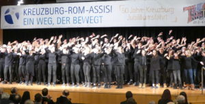 Etwa 160 Schülerinnen und Schüler stehen nach einer beeindruckenden Darstellung von Erinnerungsmomenten an ihre Schulzeit auf der Bühne des Franziskanergymnasiums Kreuzburg und singen mit Unterstützung der Bigband der Schule „Ein Hoch auf uns – ein Hoch auf unser Leben“. Das Publikum wird mitgerissen von der Musik und klatscht begeistert mit. Dies ist der Abschluss einer bewegenden akademischen Feier zum 50-jährigen Jubiläum des Franziskanerklosters Kreuzburg und des Franziskanergymnasiums sowie dem 40-jährigen Jubiläum des Franziskanischen Bildungswerkes.