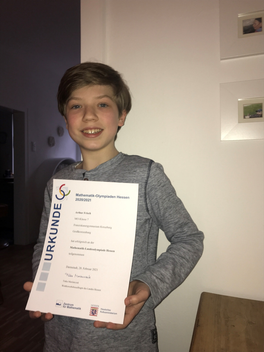 Nach Abgabe, Korrektur und Zweitkorrektur beim Veranstalter stand das Ergebnis fest – Arthur F. aus dem Jahrgang 7 zieht in die Landesrunde des Mathematikwettbewerbs mit 39 von 40 Punkten ein. Leider konnte auch die dritte Runde nicht wie geplant zentral an einem Ort stattfinden. Arthur musste, statt Olympialuft zu schnuppern, abermals von zu Hause aus antreten und schlug sich an einem Freitagnachmittag Anfang März tapfer durch die außerordentlich kniffligen Aufgaben. Mit 9 von 27 Punkten erzielte er einen Achtungserfolg für sich und die Kreuzburg. Kommendes Jahr möchte Arthur wieder an der Mathematikolympiade teilnehmen – und ab Jahrgang 8 könnte auch das Bundesfinale winken.