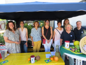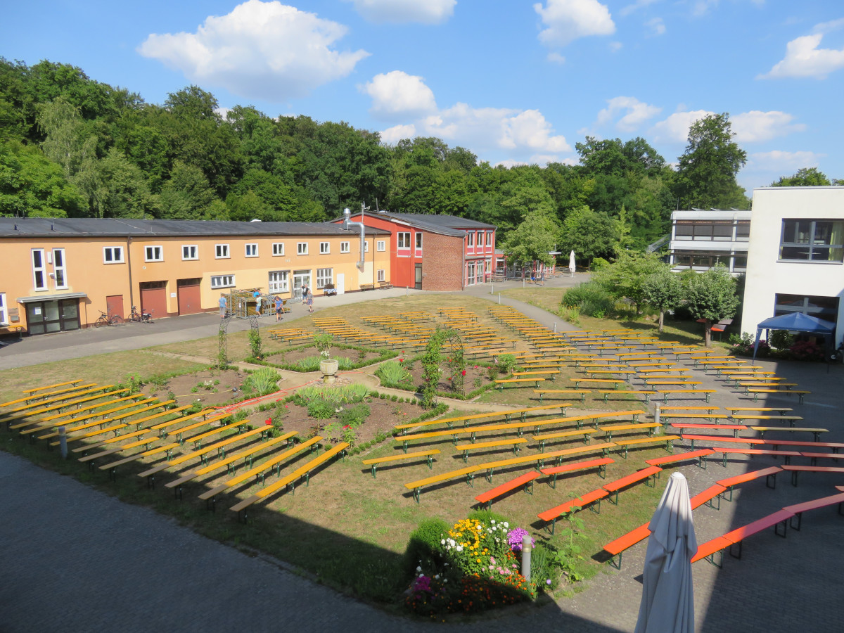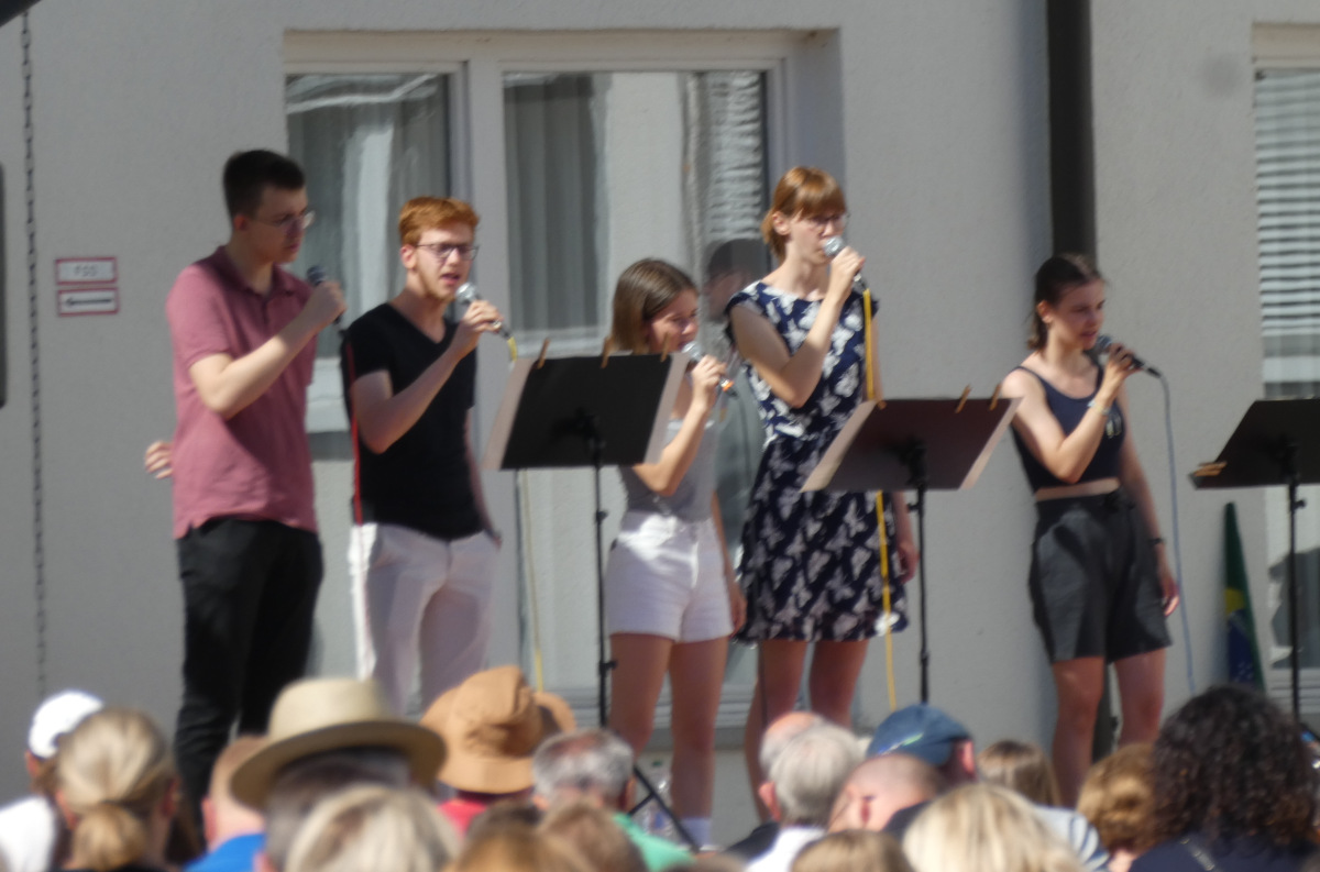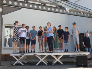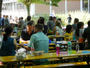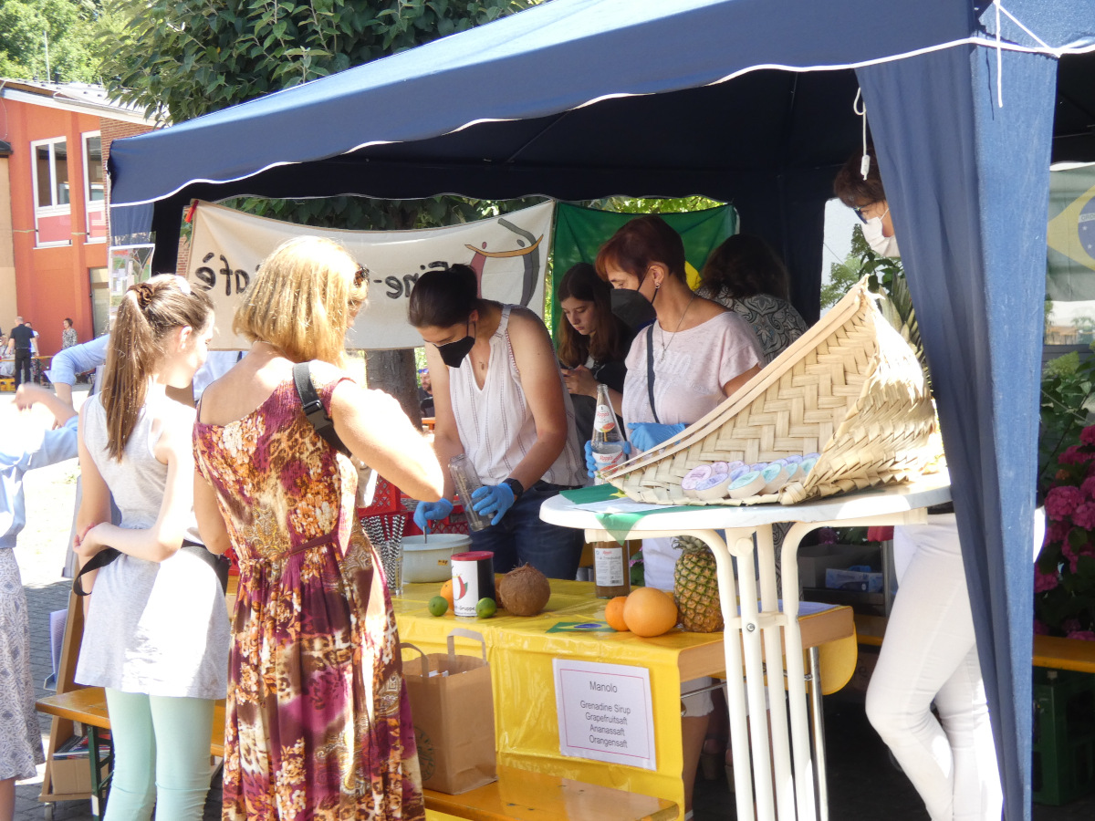 Als nächstes stand ein „chilliges“ Zusammensein auf dem Programm, die Klassenfamilien und TGs suchten ihren vorbereiteten persönlichen und größtenteils schattigen Platz rund um den Schulhof auf und genossen dort ihr Klassenbuffet oder holten sich leckere Würstchen im Brötchen, die das Cafeteria-Team vorbereitet hatte. Wer Lust auf Cocktails hatte, kam auch hier nicht zu kurz und fand den Stand der Eine-Welt-Gruppe um Bruder Bernardin, der mit seiner Technik-AG die gesamte Technik zuverlässig organisierte. Gegen Ende der Veranstaltung wurden Schülerinnen und Schüler, die im Laufe des Schuljahres besondere Leistungen erzielt hatten, geehrt. Neben Mathematik und Informatik, Jugend forscht und Jugend debattiert wurden ebenfalls die Siegerinnen und Sieger im Bereich der Sponsoringaktion TIPP 10 geehrt sowie diejenigen Fünftklässler, deren Bilder aus dem Fach Kunst in die Endrunde kamen und vom Vorstand des Lions Club Hanau und dem Hanauer OB für den diesjährigen Adventskalender ausgewählt wurden. Im Zusammenhang mit der Würdigung der Erfolge der