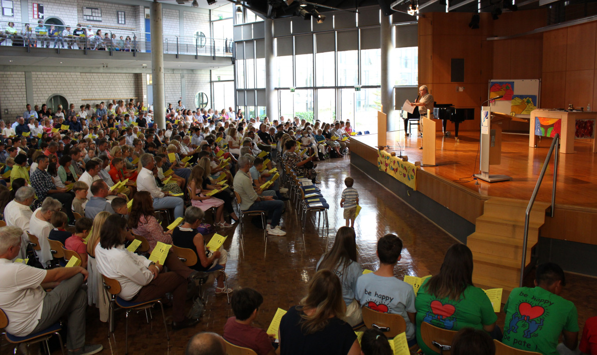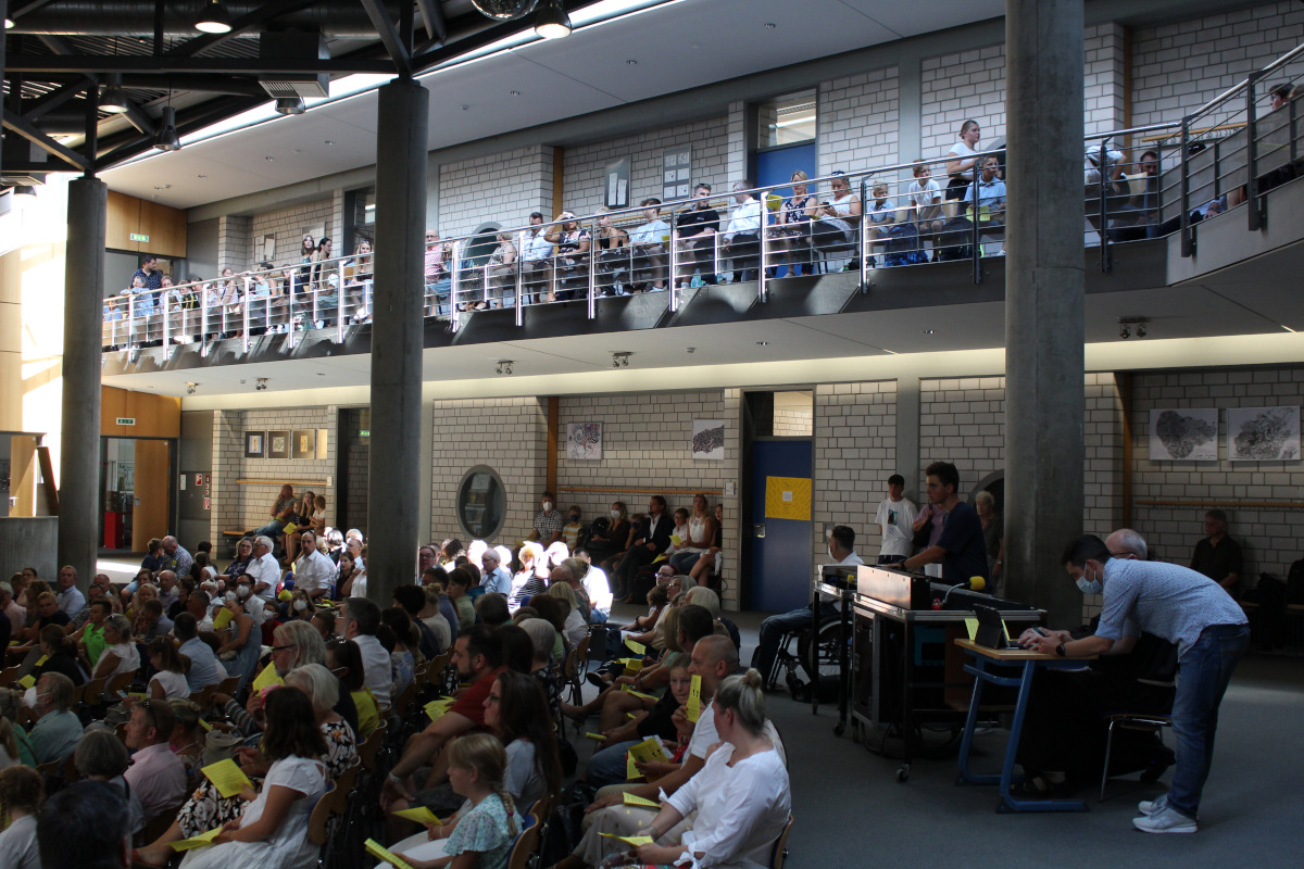 Danach kam der für die Kinder spannendste Moment, als sie, ausgestattet mit einem „Wegplakat“ in der jeweiligen Klassenfarbe, mit ihren neuen Klassenlehrerinnen und -lehrern und den Patinnen und Paten das erste Mal in ihre Klassenräume gingen, um ihre neue Klassengemeinschaft ein wenig näher zu „beschnuppern“. Währenddessen wurden die Eltern von Schulleiter Thomas Wolf, Geschäftsführer Bernward Bickmann sowie einzelnen Gremienvertretern, wie dem Freundeskreis der Schule, dem Schulelternbeirat und den Schülervertretern, begrüßt.