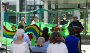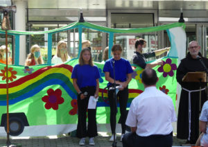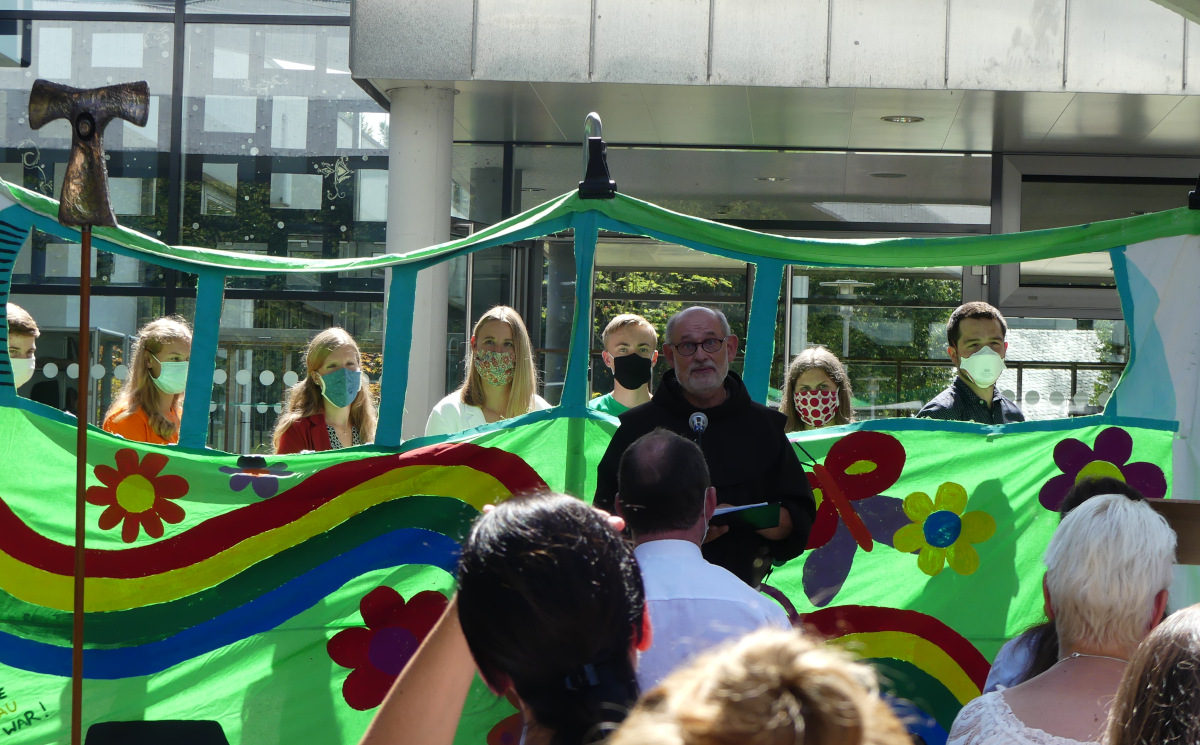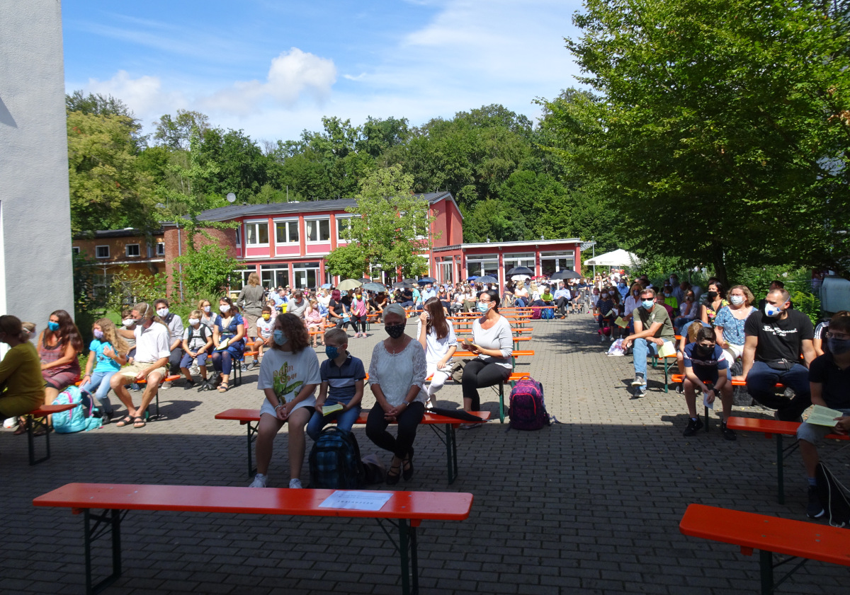 Der Schulseelsorger der Kreuzburg, Bruder Michael, gestaltete den Gottesdienst in zwei Durchgängen mit den neuen Klassenfamilien. Unter Wahrung der geltenden Abstands- und Hygieneregeln beging er zunächst mit den Englischklassen 5c-e einen Wortgottesdienst zum Thema „Einen neuen Aufbruch wagen – unsere gemeinsame Reise beginnt“. Ein zweiter Durchgang folgte mit den beiden Lateinklassen 5a und 5b. Die Kinder erwartete ein farbenfroher Reisebus, die Fahrkarten zur Mitnahme hatten die „Businsassen“ zuvor zu Hause selbst ausgestaltet und mitgebracht. Nach einem verregneten Vormittag riss pünktlich zum ersten Durchlauf der Himmel auf, sodass bei strahlendem Sonnenschein Gottesdienst gefeiert wurde, denn auch das war dieses Jahr neu: Zum ersten Mal fand der Aufnahmegottesdienst im Freien statt, auf dem hinteren Schulhof zwischen Haupteingang und Cafeteria. Leider kamen die Lateinklassen im zweiten Durchgang aber nicht mehr trockenen Fußes ins Schulgebäude.