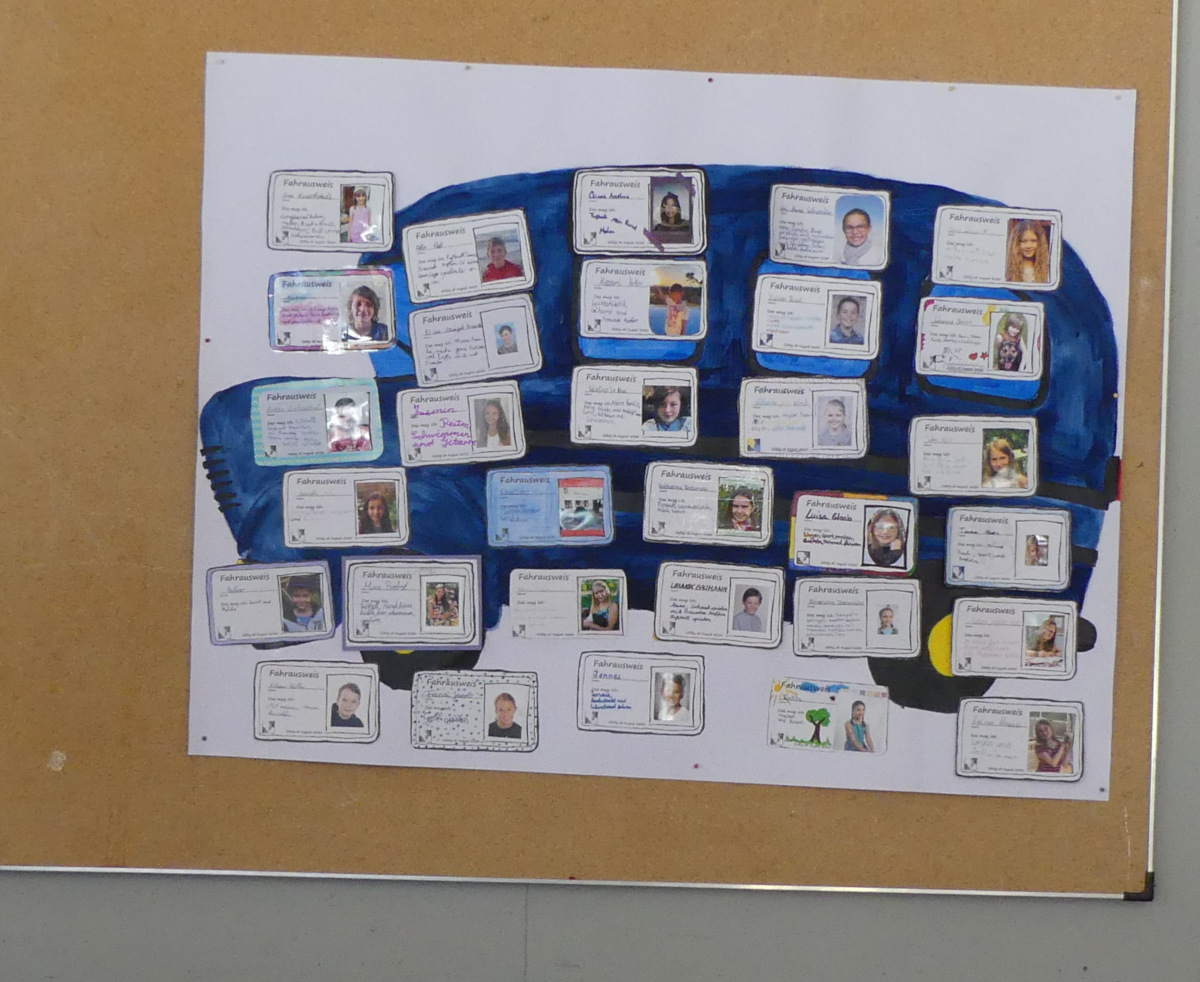 Nach dem Wortgottesdienst erwartete die Kinder der spannendste Moment, als sie mit ihren „Busfahrern“, also den neuen Klassenlehrern und -lehrerinnen, den Paten und Patinnen und ihrem in der jeweiligen Klassenfarbe bemalten Reisebus das erste Mal in ihre Klassenräume gingen, um ihre neuen Klassenkameraden und Klassenlehrer ein wenig näher kennenzulernen.