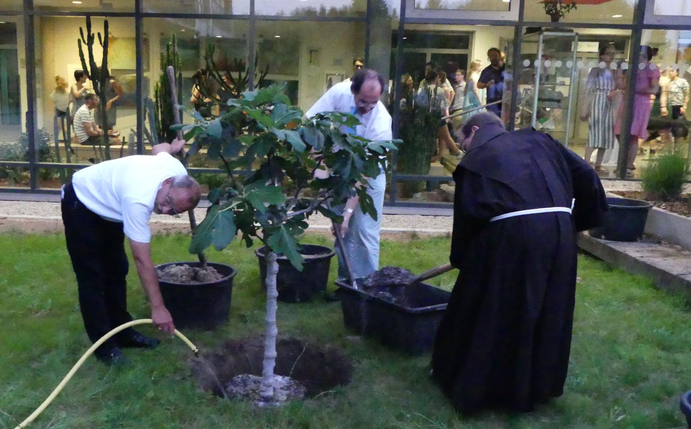 „37-mal wird der Feigenbaum in der Bibel erwähnt“ führt Pater Cornelius Bohl ofm an, während er zusammen mit dem Schulleiter Thomas Wolf und Geschäftsführer Bernward Bickmann vor dem Eingang des Franziskanergymnasiums Kreuzburg einen ebensolchen Baum eingräbt. Der Provinzial der Franziskaner war hierzu extra aus München angereist. Im letzten Jahr hatte die Kreuzburg ihr 50-jähriges Jubiläum mit vielen kleinen und großen Ereignissen gefeiert und nun sollte noch eine bleibende Erinnerung geschaffen werden. Es ist eine Tradition an der Schule bei besonderen Begebenheiten ein Baum zum Andenken zu pflanzen. Für den Jubliäumsbaum wurde ein Platz ausgewählt, an dem jeder, der die Schule über den Haupteingang betritt, vorbeigeht. Da es dort sehr sonnig und trocken ist, sei der Feigenbaum für diesen Standort ideal, erklärte der Schulleiter in einer kurzen Ansprache.