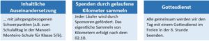 Eine inhaltliche Vorbereitung z.B. zur Frage Was ist die Manoel-Monteiro-Schule und warum laufen wir für sie? findet in einer KL-Stunde vor dem Franziskustag statt. Ab dann finden die Lernenden bis zum 02.10.2024 Sponsoren, die sie entweder mit einem festen Betrag oder einem Betrag pro gelaufenem Kilometer unterstützen.