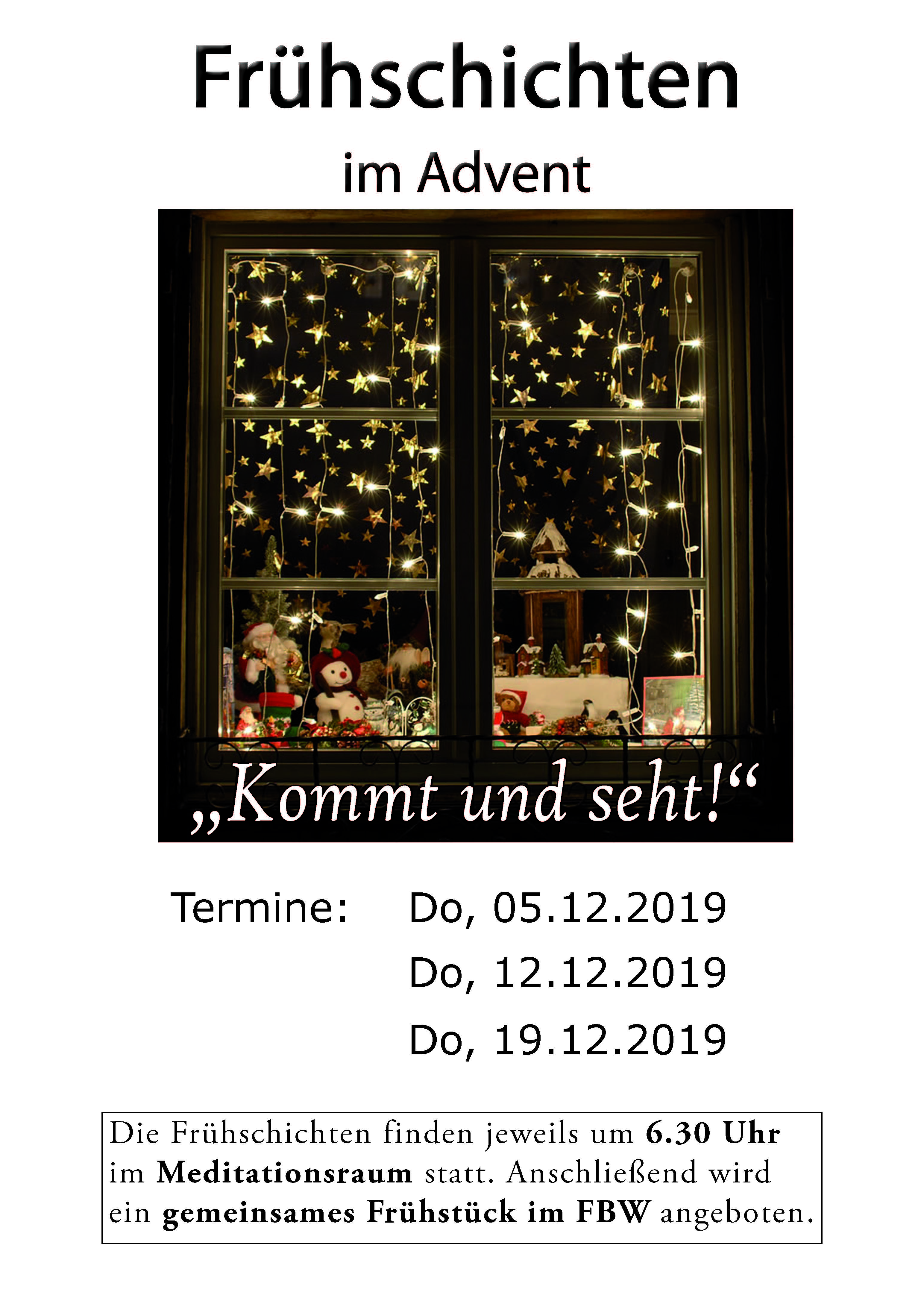 Herzliche Einladung zu den Frühschichten mit dem Thema „Kommt und seht!“ während der Adventszeit jeweils am Donnerstagmorgen um 6.30 Uhr im Meditationsraum. Anschließend besteht das Angebot zu einem gemeinsamen Frühstück im FBW.