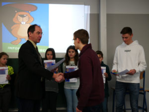 Im Rahmen einer Würdigung erhielten die Preisträger ihre Urkunden und ihre Preise zusammen mit einer zusätzlichen kleinen süßen Anerkennung der Fachschaft Informatik von Schulleiter Thomas Wolf und Fachsprecher Informatik, Heiko Sauer, überreicht.