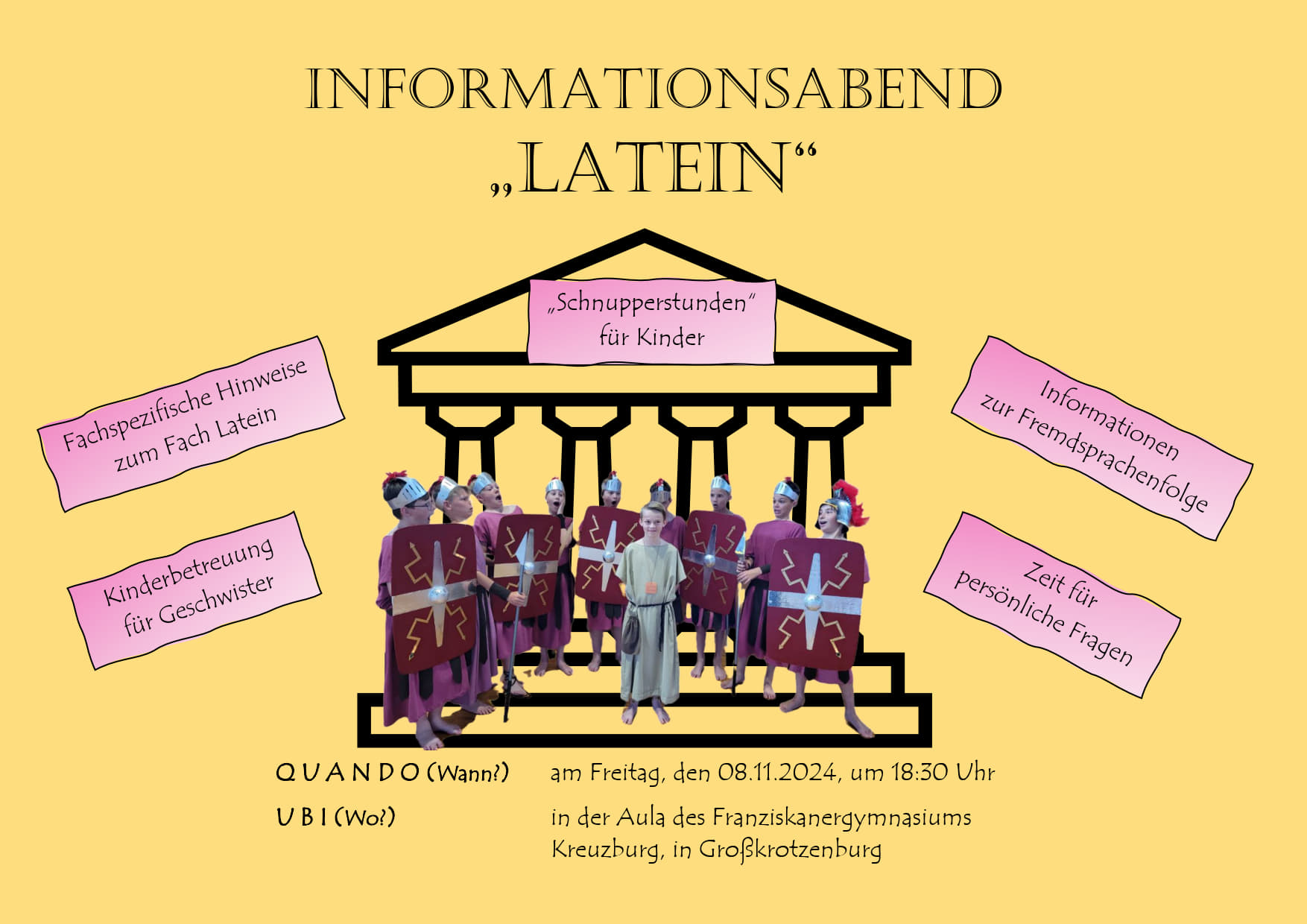 Der Wechsel von der Grundschule auf eine weiterführende Schule ist für Familien immer mit der Frage verbunden, welche Fremdsprachen ihr Kind künftig lernen soll und in welcher Reihenfolge. So überlegen Eltern gemeinsam mit ihren Kindern, welche Gründe für die Wahl von Latein als 1. Fremdsprache sprechen. Um Antwortmöglichkeiten auf diese Frage zu bieten, lädt die Fachschaft Latein des Franziskanergymnasiums Kreuzburg zu einem Informationsabend am Freitag, 08. November 2023, ab 18:30 Uhr in die Aula nach Großkrotzenburg ein.