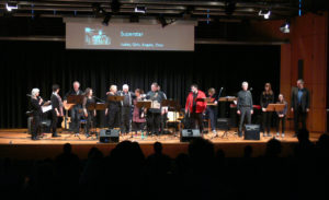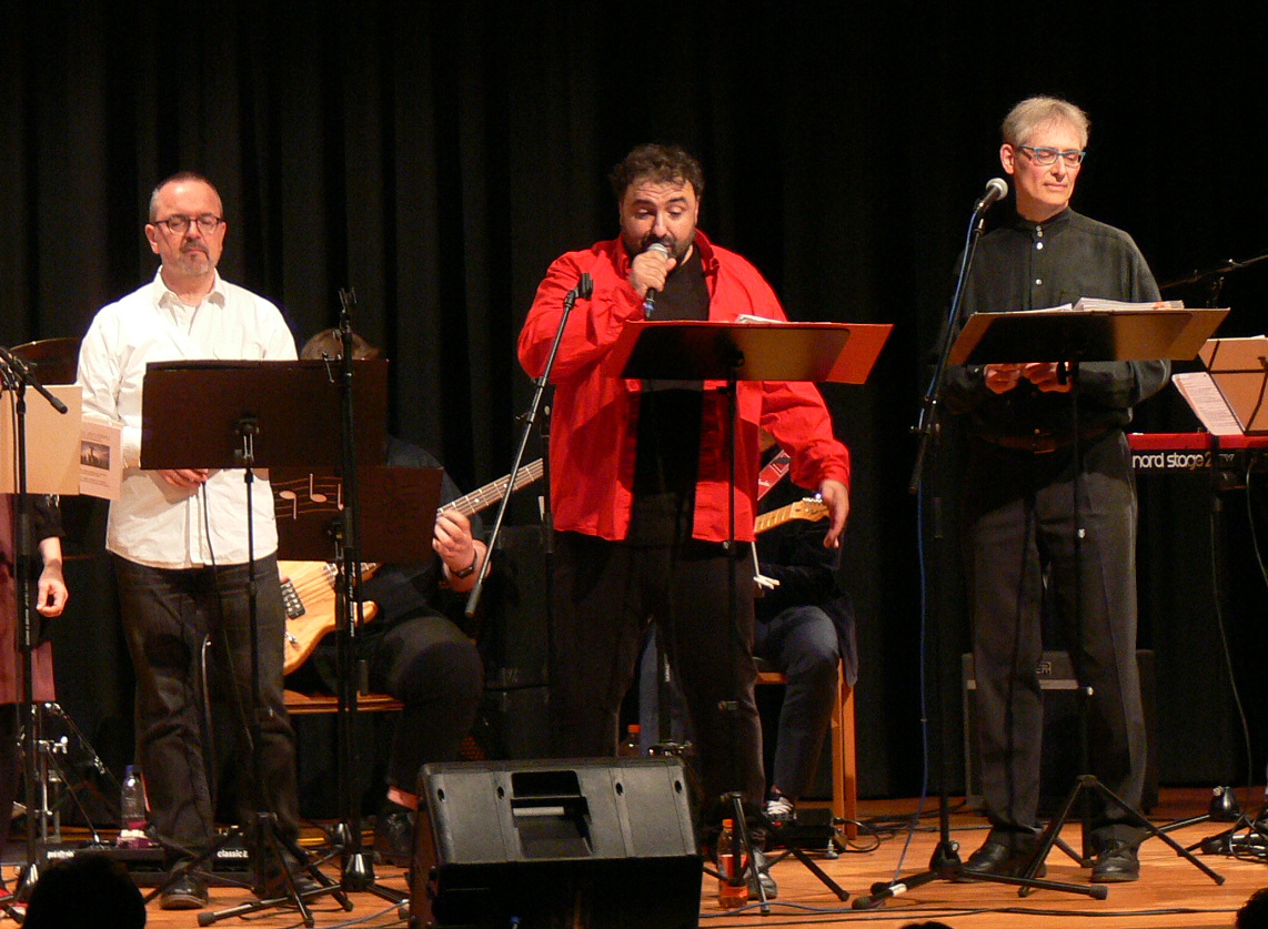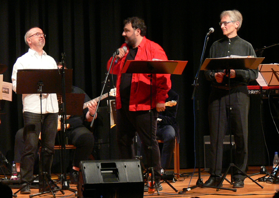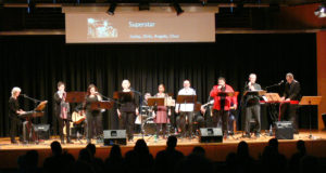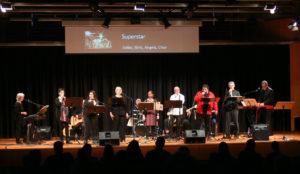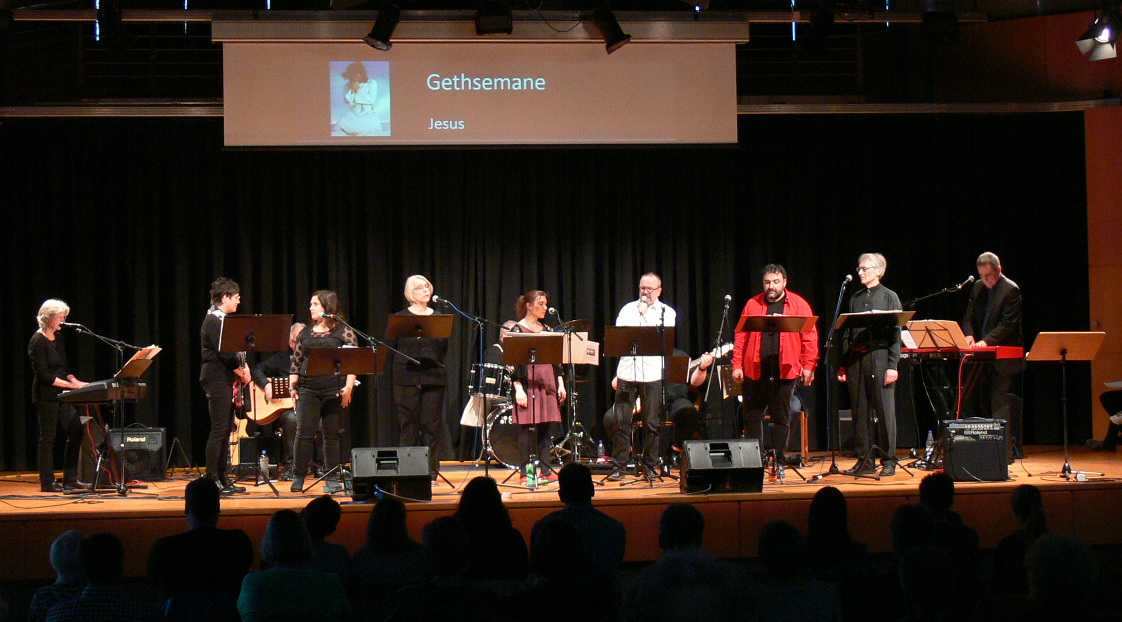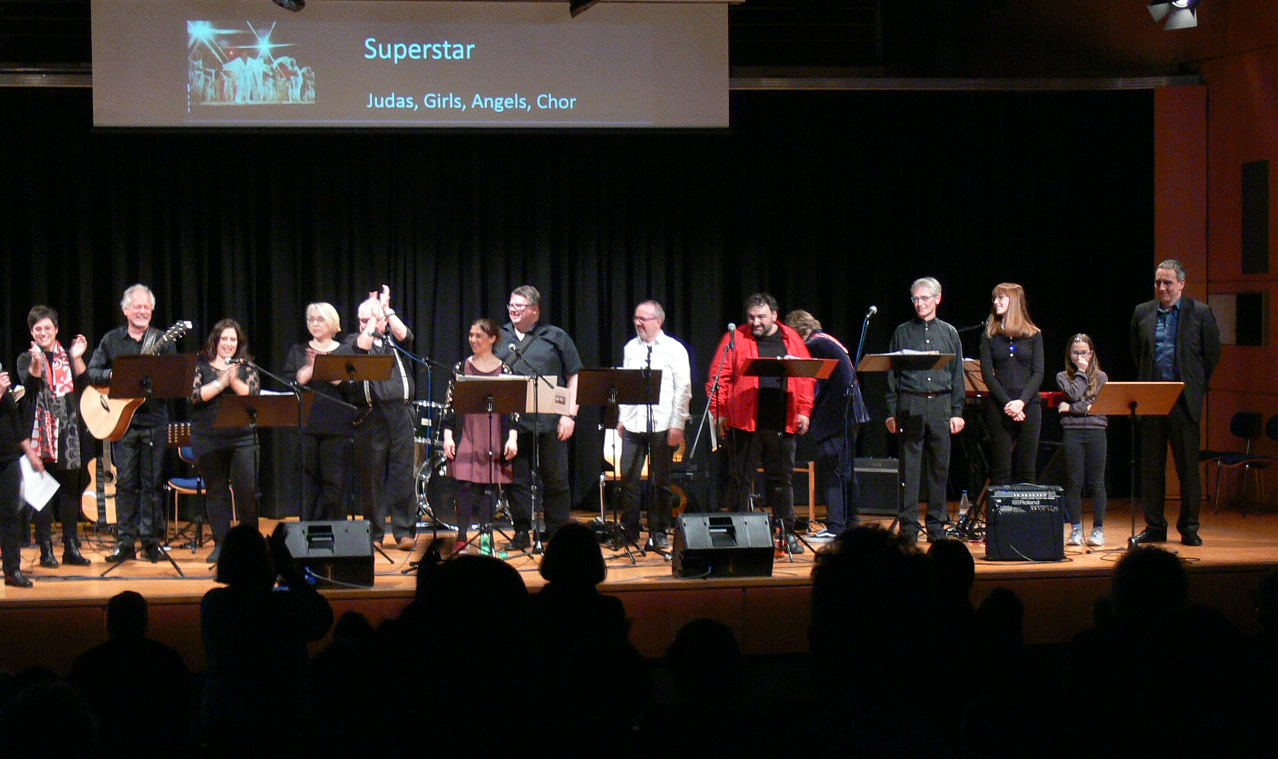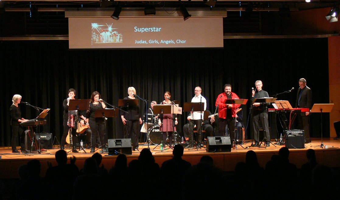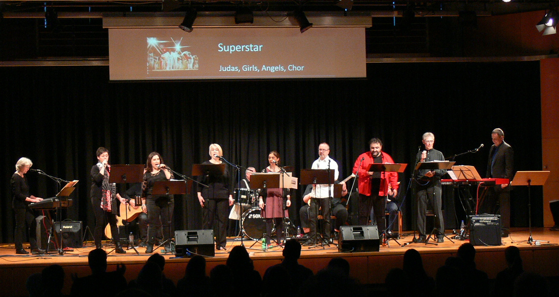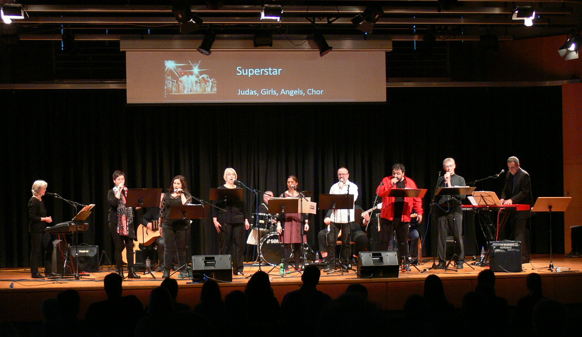Projektchor und -band „Geheimnis des Glaubens“, bestehend aus 13 Musikern, Sängerinnen und Sängern, hatten sich an einige Stücke aus dem Musical gewagt und sich auch lebhaft mit den englischen Liedtexten auseinandergesetzt. Mit zwei E-Gitarren, Bass, Keyboard und Schlagzeug wurden die Songs begleitet.