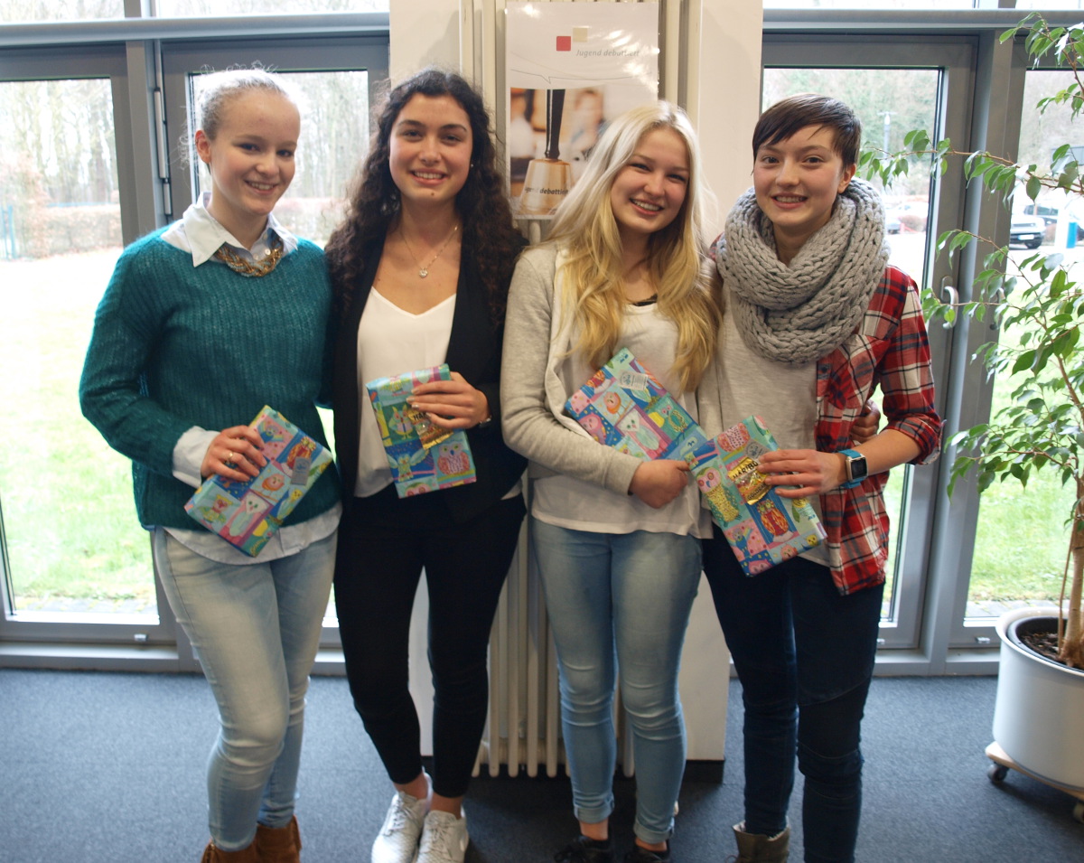 Für die rein weibliche Enddebatte qualifizieren konnten sich Pascale K., Jana B., Sophia S. und Gina S.. Dieses Schulfinale, moderiert von Herrn Knedlik, fand am 5.2.2016 in der Bibliothek statt. Die fachkundige Jury bestand aus Frau Schuster (Bibi), Herrn Knedlik und dem ehemaligen Teilnehmer Simon Barlovits, der im Jahr 2012 ins Finale des Regionalentscheids vorgestoßen war. Debattenthema war die Frage, ob Kaffeebecher „to go“ mit Pfand belegt werden sollten.