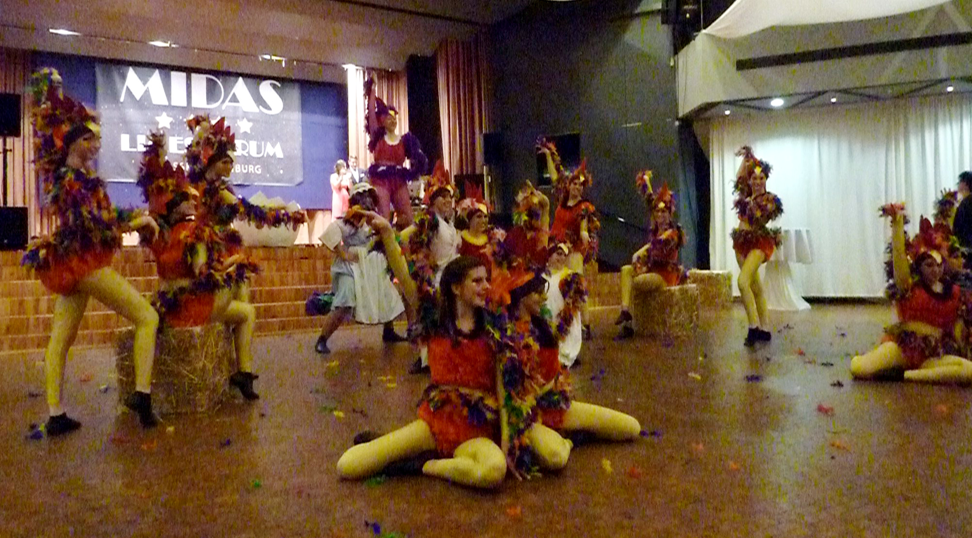 Das Unterhaltungsprogramm läuteten auch diesmal wieder Patrick P. und Alexander P. ein, indem sie humorvoll und pantomimisch etwas über das klassische Theater aufführten. Später traten sie noch einmal mit dem Stück „Der 90. Geburtstag“ auf, in welchem Butler James die imaginären Gäste der Jubilarin Frau Wolf verköstigt. Mit einer kichernden Frau Dähn, dem etwas zerstreuten Bruder Bernadin, dem Witze-erzählenden Herrn Franke und der ermahnenden Frau Pfeifer wurden die Lachmuskeln des Publikums ordentlich strapaziert. Ergänzt wurde das Stück durch ein „echtes“ Tigerfell …Für die tänzerische Darbietung war es gelungen die Tanzgarde des TV-Großkrotzenburg mit ihrem Showtanz „Im Hühnerstall, da ist was los“ zu gewinnen. Mit ihrem unterhaltsamen und abwechslungsreichen Showtanz unter der Leitung von Ute Böning boten sie schon einen Vorgeschmack auf die diesjährige (leider sehr kurze) Faschingssaison. Viele der Tänzerinnen und der eine Tänzer sind Schüler der Kreuzburg und wurden euphorisch begrüßt.