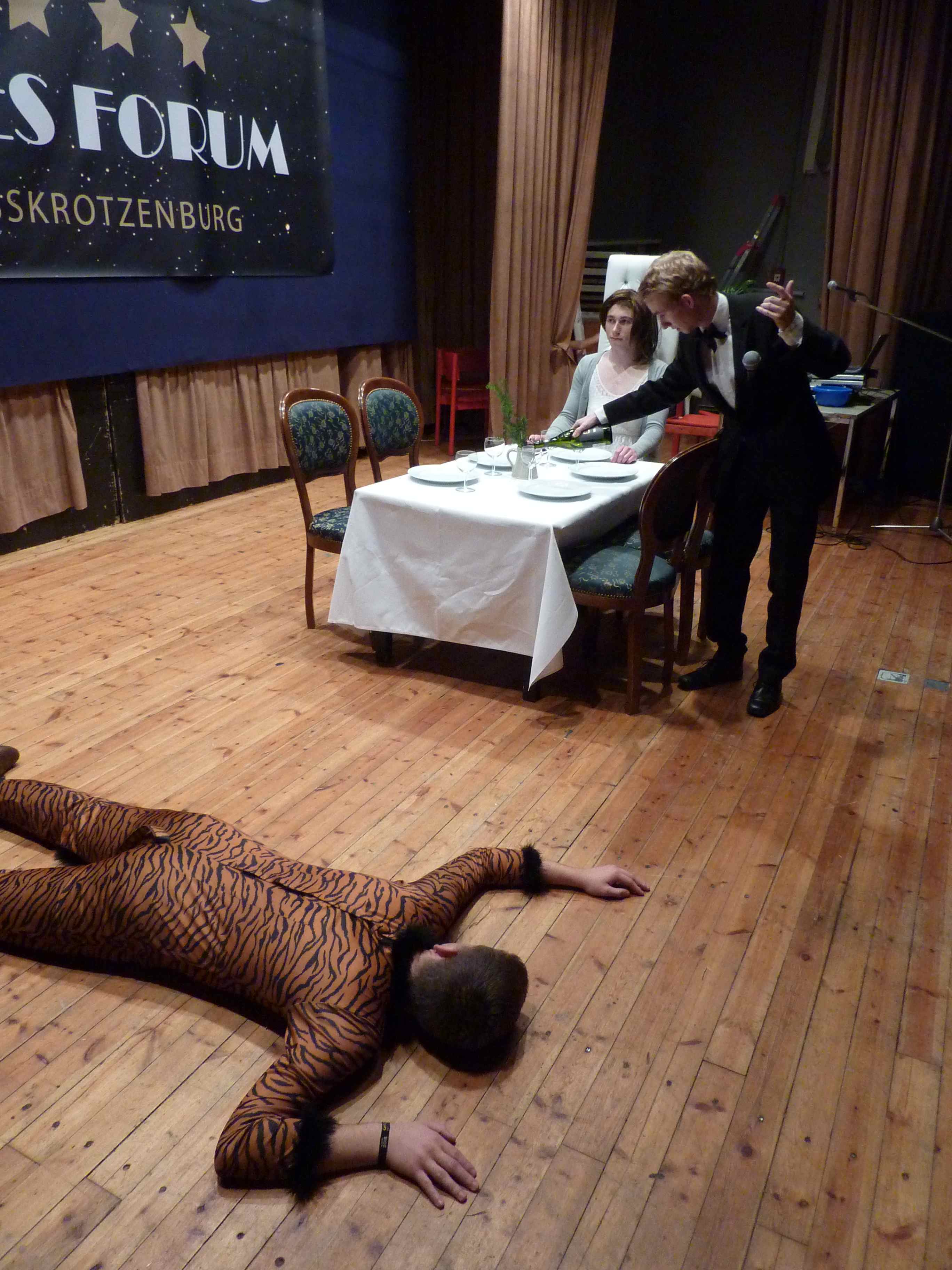 Das Unterhaltungsprogramm läuteten auch diesmal wieder Patrick P. und Alexander P. ein, indem sie humorvoll und pantomimisch etwas über das klassische Theater aufführten. Später traten sie noch einmal mit dem Stück „Der 90. Geburtstag“ auf, in welchem Butler James die imaginären Gäste der Jubilarin Frau Wolf verköstigt. Mit einer kichernden Frau Dähn, dem etwas zerstreuten Bruder Bernadin, dem Witze-erzählenden Herrn Franke und der ermahnenden Frau Pfeifer wurden die Lachmuskeln des Publikums ordentlich strapaziert. Ergänzt wurde das Stück durch ein „echtes“ Tigerfell …