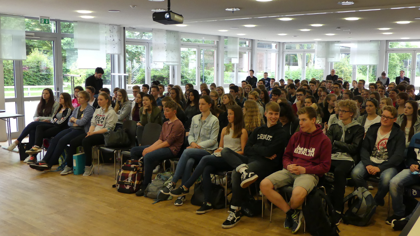 „Man kann eigentlich nichts verkehrt machen“. Dieses Fazit zog am 16. Juni 2016 Elias Spreiter, der als Referent für Energiepolitik im hessischen Wirtschaftsministerium arbeitet und der auf Einladung von Herrn Reichert passend zum Powi-Thema der E2-Phase einen Vortrag für alle Zehntklässler über die Energiewirtschaft und Energiewende hielt. Den Schülern wurden zunächst die landschaftlichen Veränderungen durch die üblichen Energie- und Ressourcengewinnungsmethoden im Vergleich zu denen der erneuerbaren Energien vor Augen geführt. Bereits an diesem Punkt des Vortrags zeigten sich die Vorteile und auch vor allem die Begeisterung des Referenten für die Energiewende. Er erläuterte die Richtlinien der Energiewende-Politik und versuchte, den Schülern deutlich zu machen, dass die Energiewende niemandem schaden solle, sondern nur helfe. Dabei ging er auch auf die Probleme ein, die die Durchsetzung von Projekten in diesem Bereich mit sich bringt. So stehe dem Bau von Windkraftanlagen häufig der Tierschutz (Fledermäuse, Feldmäuse) entgegen oder es fehle die Akzeptanz und Bereitschaft zu Solaranlagen auf dem eigenen Hausdach – auch wegen unzureichender Fördermöglichkeiten.