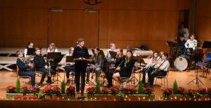 Nach zwei Jahren Coronapause konnte Ulrike Hoffmann als Fachsprecherin Musik in der vollbesetzten Aula der Kreuzburg wieder die Gäste zu den traditionellen Weihnachtskonzerten begrüßen und startete mit der kleinen Bigband den Abend.