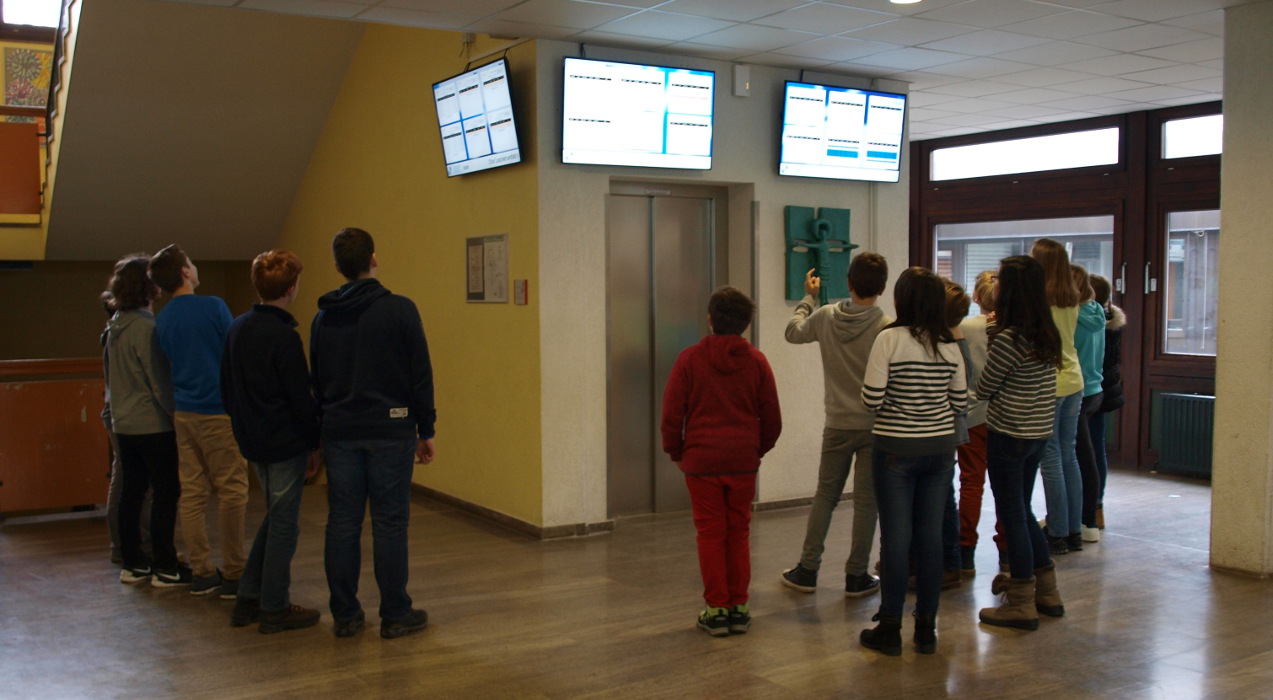 Durch eine Spende des Freundeskreises konnten im E-Gebäude, in dem sich die naturwissenschaftlichen Fachräume sowie die Räume für Kunst und Musik, befinden, drei neue digitale schwarze Bretter (DSBs) aufgehängt werden. Schüler und Lehrer können dort nun den Vertretungsplan und weitere Informationen direkt sehen.