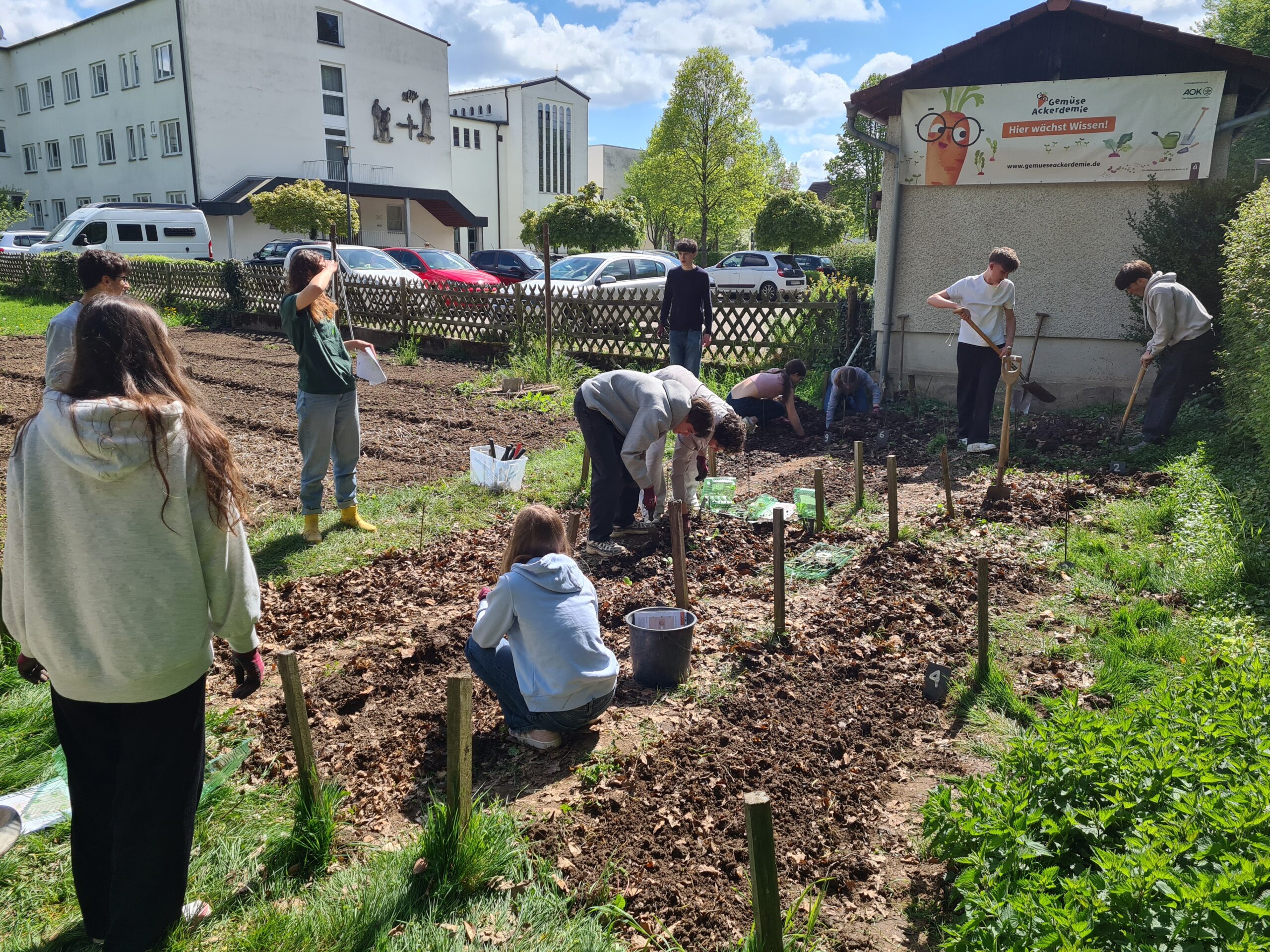 Mitterweile im vierten Jahr besteht eine Kooperation der Kreuzburg mit der GemüseAckerdemie – einem bundesweiten Bildungsprogramm, dass Schulen dabei unterstützt Kinder und Jugendliche zu Nachhaltigkeitsprofis und Gemüsegärtnern werden zu lassen. Zwei Freie Lernbereiche der Jahrgangsstufen 9/10 mit dem Titel „Zukunftswerkstatt“ profitierten in der Vergangenheit von einer Lernplattform, Bio-Saatgut und starken Jungpflanzen – aber auch von punktuellen Expertenbesuchen, wie in der vergangenen Woche. Die erste Pflanzung im Klostergarten stand an. Die Lernortbegleiterin Stephanie Unruh der GemüseAckerdemie erweiterte das Wissen und Können rund um das Legen von Kartoffeln, das Stecken von Zwiebeln, die Aussaat von Radieschen und vielem mehr.