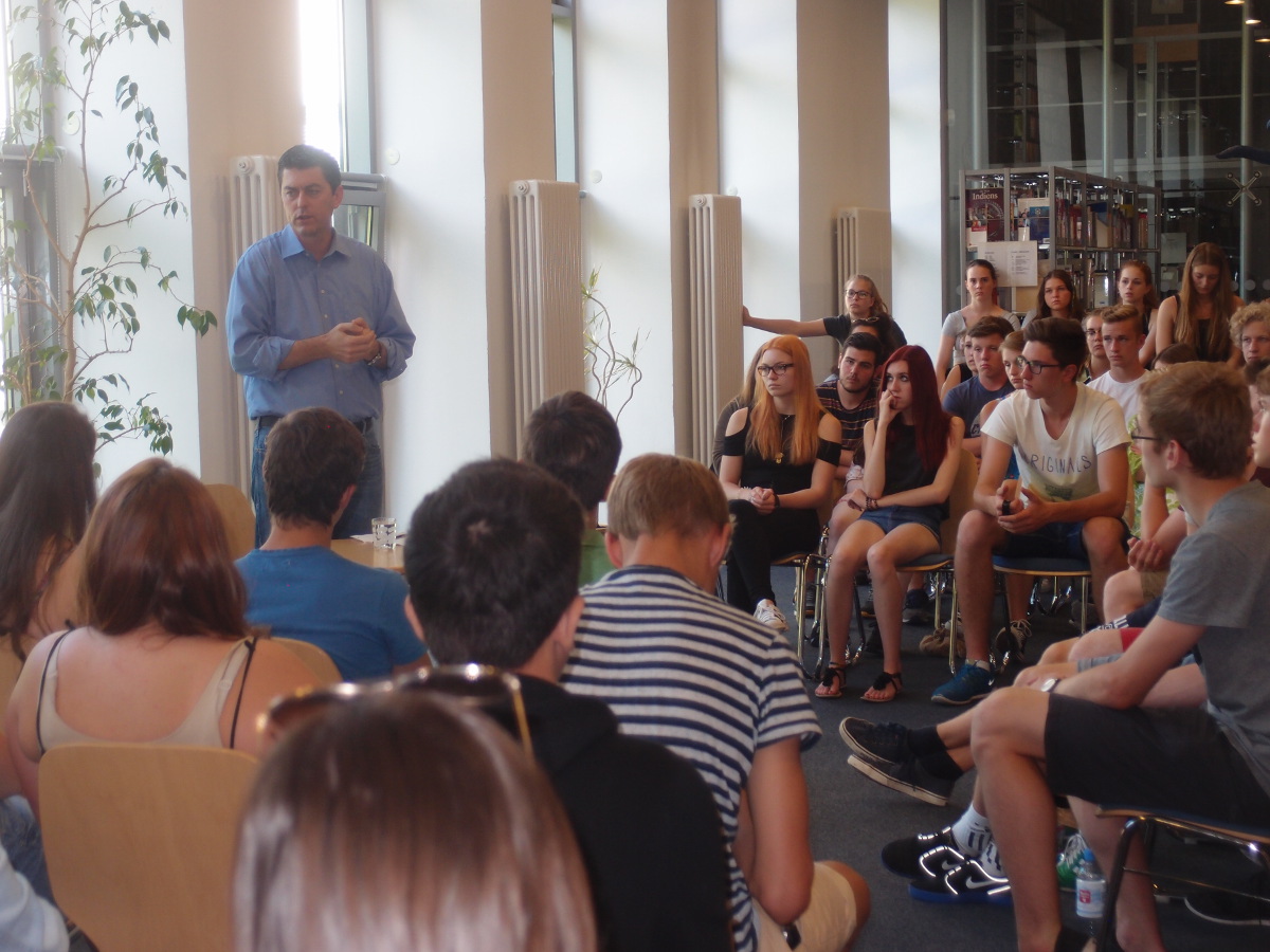 Dr. Sascha Raabe diskutiert mit Schülern des Kreuzburg-Gymnasiums.