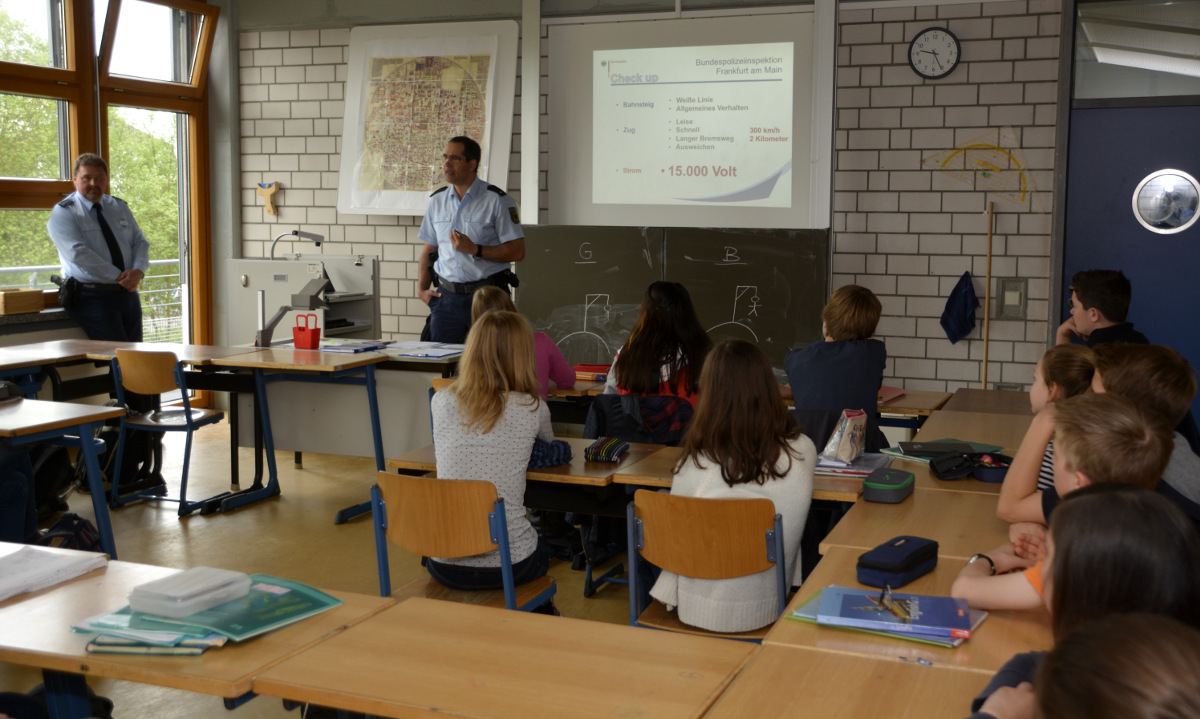 Herr Dönges und Herr Vogelmann von der Bundespolizei Frankfurt hatten ihr Programm an die Altersstruktur der 7er angepasst und verbrachten jeweils eine Doppelstunde in jeder 7. Klasse. Sie hatten einen Film mitgebracht, der auf recht drastische Weise die Gefahren von unangemessenem Verhalten am Bahnhof zeigte und seine Wirkung auf die Schüler nicht verfehlte. Im Anschluss gab es ausreichend Zeit zum Gespräch, wobei auch das Thema „Strafmündigkeit“ eine Rolle spielte.