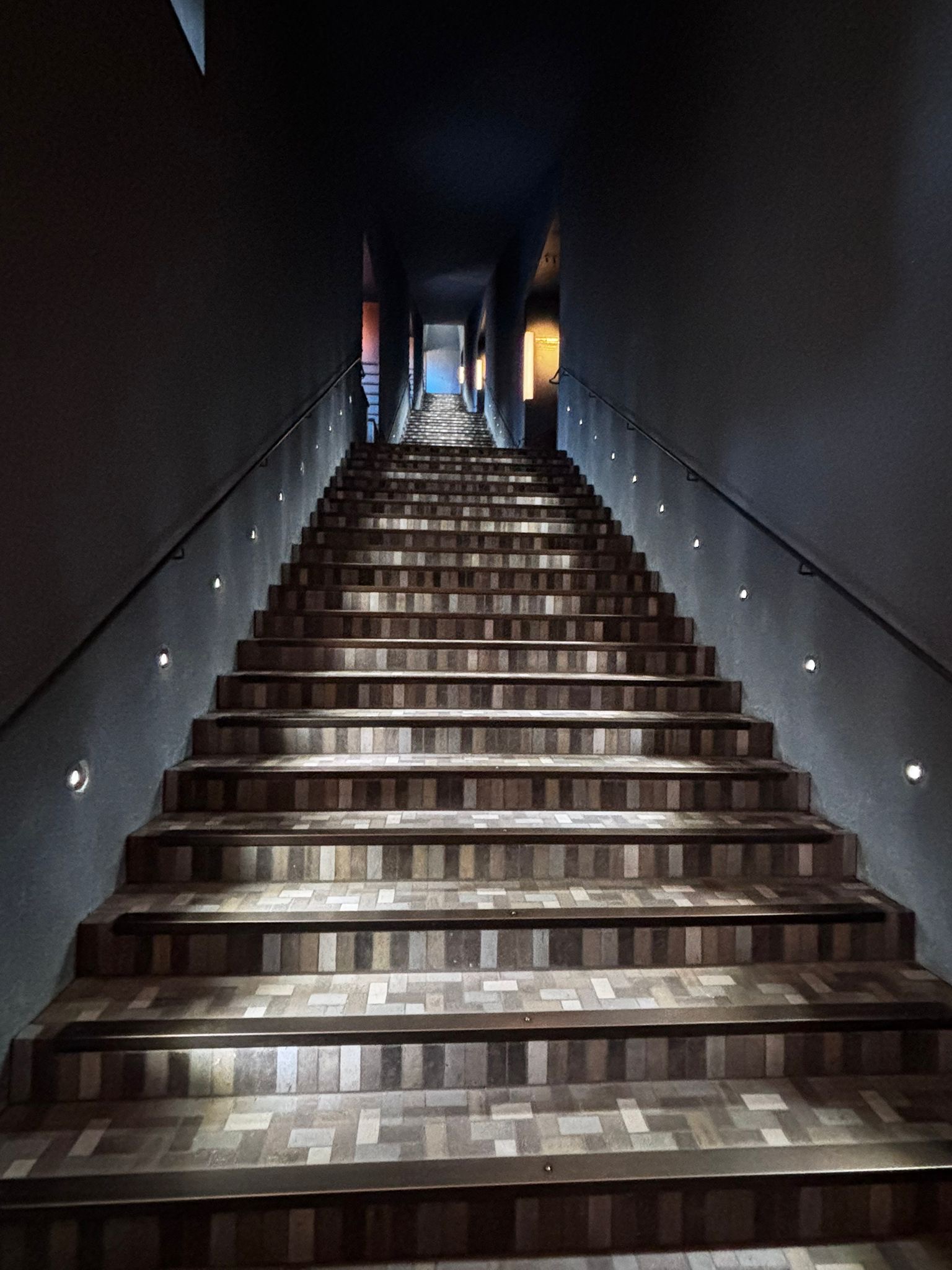 Anschließend fand ein Rundgang statt, welcher sich auf die Ausstellungen im Museum konzentrierte, und diese mit Hintergrundinformationen, vorgetragen von einer Studentin, näher beleuchtete. Der Rundgang startete mit der sogenannten „Himmelstreppe“, die durch die verschiedenen Ausstellungsebenen führte und die dem Kurs bereits durch Heinrich von Ofterdingen aus dem Unterricht bekannt war. Auf der ersten Ebene gab es eine Goethe-Ausstellung mit verschiedenen Gemälden und Informationen über diesen. Die zweite Ebene widmete sich bedeutenden Dichtern und Künstlern der Romantik, darunter auch Novalis und Eichendorff, die dem Leistungskurs dank Herrn Esche bereits aus dem Unterricht sehr vertraut sind. Hier konnte man ebenfalls Facettenreiches über die Entstehung berühmter Dichtungen und Werke erfahren. Am Ende der Treppe gab es ein zentrales Symbol der Romantik, nämlich die Nachtigall, die sogar elektrisch gesteuert alle zehn Minuten Töne sang. Insgesamt konnten im Museum viele Motive der Romantik, wie beispielsweise die Sehnsucht und Natur, erkannt werden. Zusätzlich gab es auf der letzten Ebene viele Gemälde und auch Architektur der Epoche. Von den Informationen, die während der Führung vorgetragen wurden, berieselt, hatte der LK nunmehr Bewegungsfreiheit im Museum. Der abschließende Arbeitsauftrag von Herrn Esche war es, den Begriff der Romantik fotografisch zu interpretieren, was, der Architektonik dieses Bauwerks geschuldet, ein wohlwollender Auftrag war.