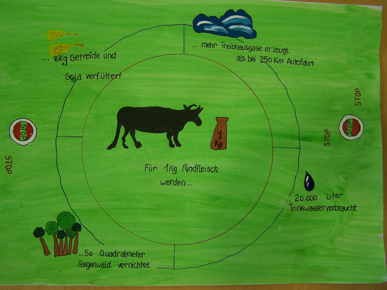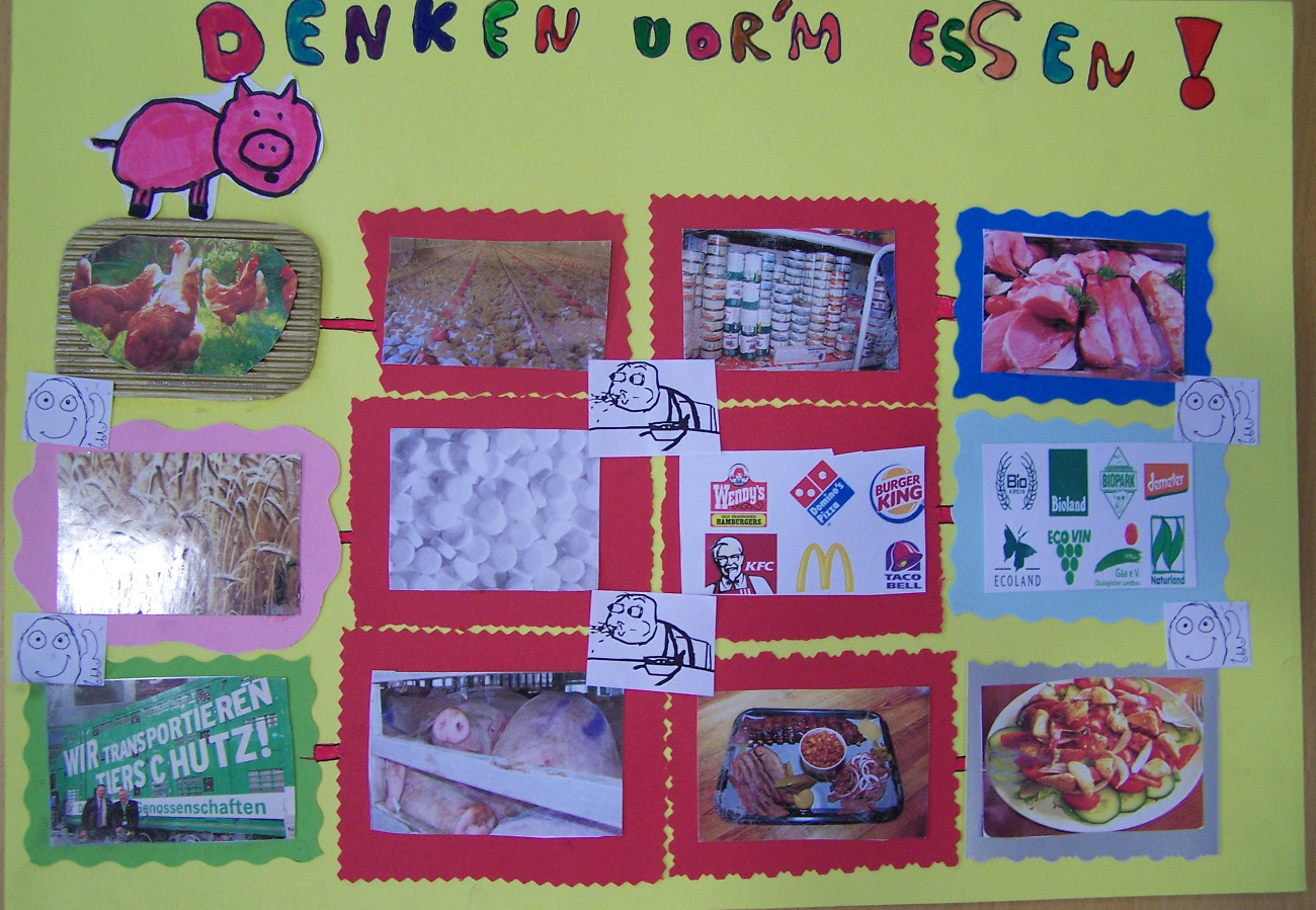 An dem Kreativwettbewerb zum Franziskustag, bei dem es galt, ein Plakat zu entwerfen, das für einem verantwortungsvollen Fleischkonsum wirbt, beteiligten sich zahlreiche Schülerinnen und Schüler. Unter den vielen gelungenen Ergebnissen ragten folgende Sieger hervor: Karsten B. (5g), Alysha W. (5a), Lana R. (5g) und Lilly W. (5g).