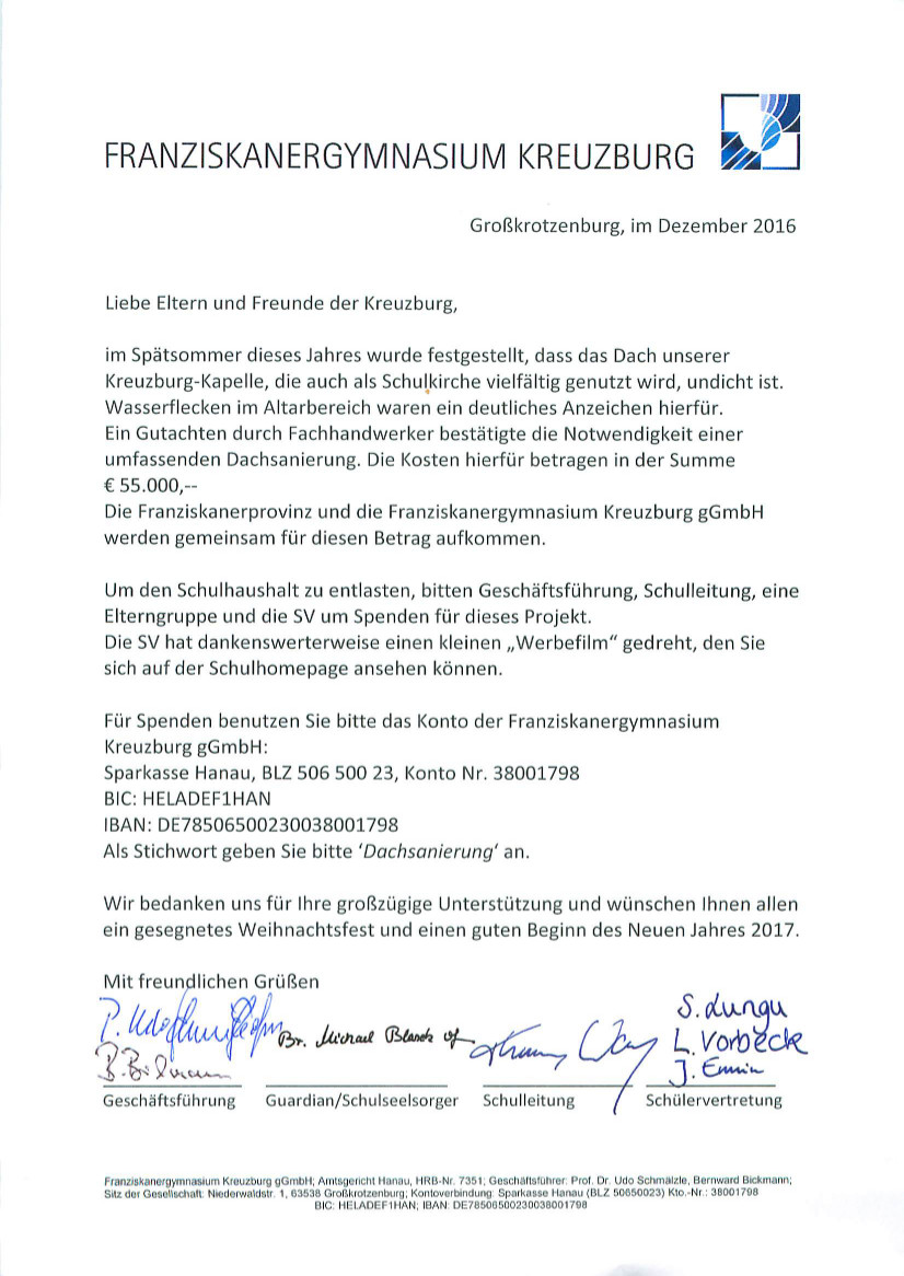 Die Kosten für die Dachsanierung betragen in der Summe 55.000 €.Geschäftsführung, Schulleitung, eine Elterngruppe und die SV bitten um Spenden für dieses Projekt, den Spendenaufruf können Sie nebenstehend nachlesen.