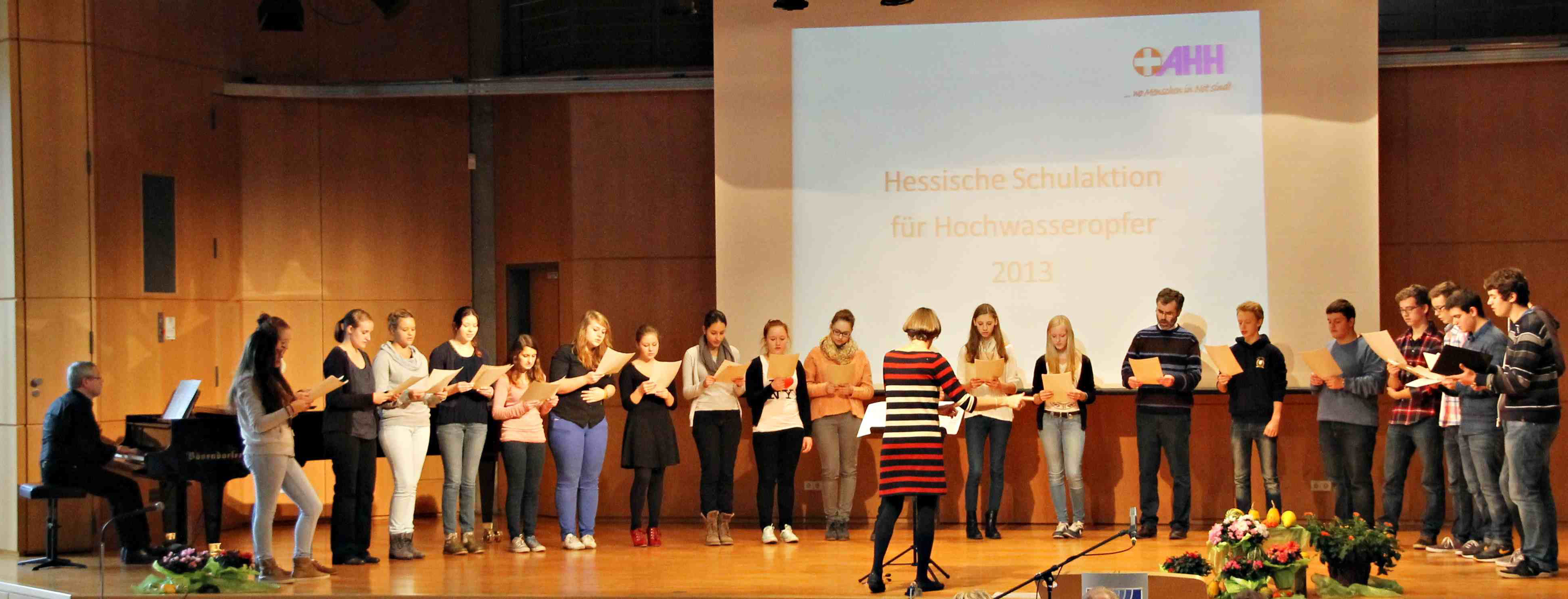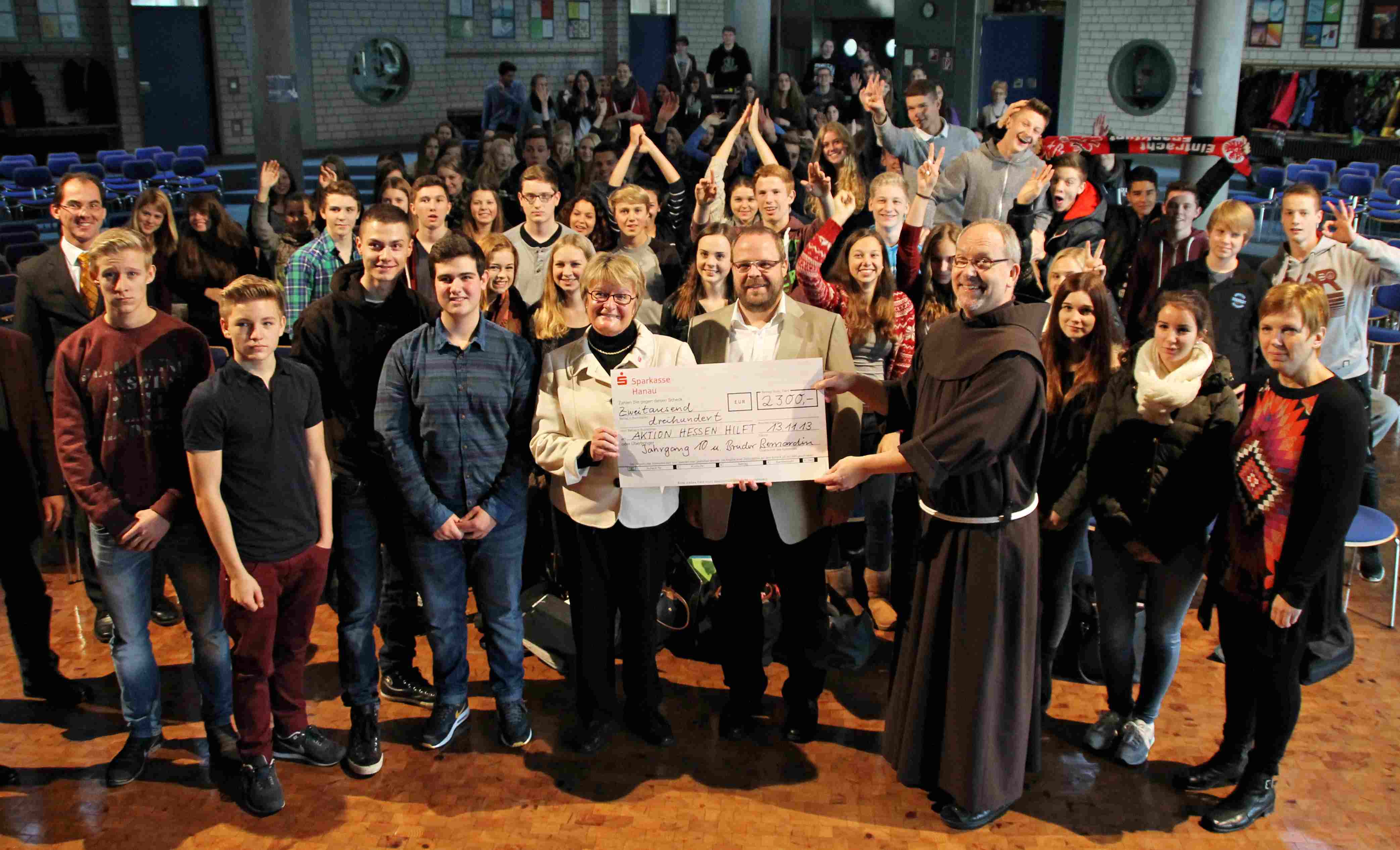 So konnte am Mittwoch, den 13. November 2013, der „Aktion Hessen hilft e.V.“, vertreten durch den Vorsitzenden Tobias Greilich und die Schirmherrin Dorothea Henzler MdL, die Spende überreicht werden. Die beiden Vertreter nahmen sich Zeit für eine Begegnungsstunde mit den betroffenen Schülern, Vertretern der Eltern und Bruder Bernardin Marker ofm, von dem die Idee zur Spende stammte und der die Initiative ergriff und die Koordination für die Feierstunde übernahm. In der Aula der Schule wurden die Ereignisse der Nacht nochmals in Erinnerung gerufen und Tobias Greilich informierte über die Arbeit der „Aktion Hessen hilft“, die vorwiegend die Hochwassergeschädigten im Kreis Wittenberg unterstützt. Schulleiter Thomas Wolf äußerte sich in einer kurzen Ansprache erfreut darüber, dass die Schüler im Sinne der franziskanisch-christlichen Prägung der Schule das Geld einem guten Zweck zuführen wollen.