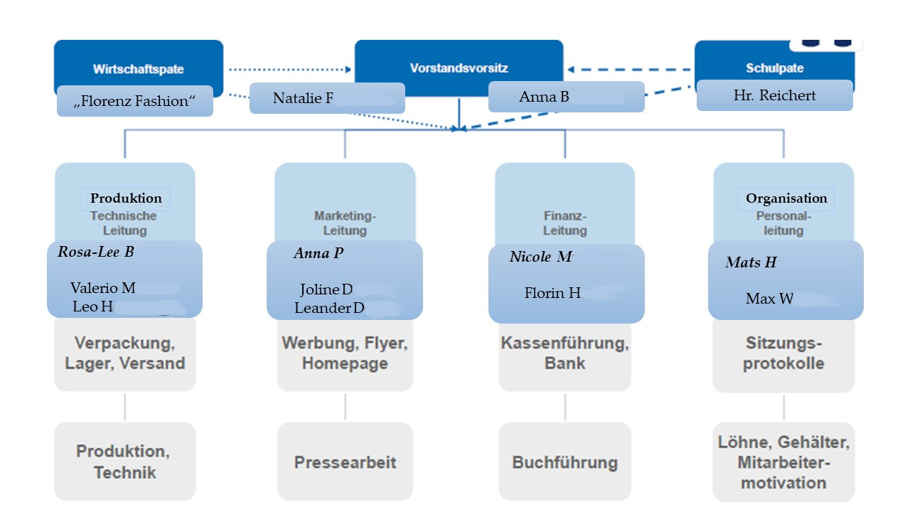 In den anschließenden Wochen galt es nun, die Firma zu gründen, um dann inhaltliche Fortschritte zu erzielen. Als wir uns bei iw junior, einem Abzweig des Institutes für Wirtschaft in Köln, als Firma registriert hatten, konnte mithilfe von Herrn Reichert die Struktur der Firma aufgebaut werden. Dazu wurden die Schülerinnen und Schüler in fünf Abteilungen, je nach ihren persönlichen Stärken und Fähigkeiten, eingeteilt. Diese Abteilungen umfassen Bereiche wie Produktion, Finanzen, Personalorganisation, Marketing und den Vorstand. Jeder Bereich hat somit seine eigene Aufgabe zugeteilt bekommen, um die er sich während des Schülerfirmenprojekts verantwortlich kümmern muss.