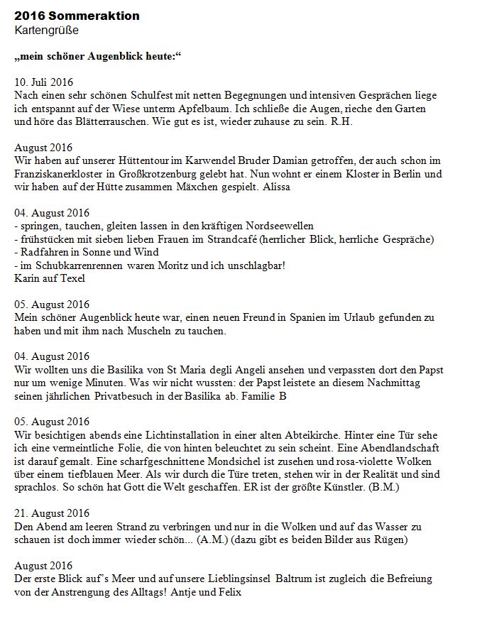 In diesem Sommer sammeln wir schöne Augenblicke aus den Ferien. Eine weitere beim Sommerfest ausgeteilte Postkarten erzählt von folgenden Eindrücken