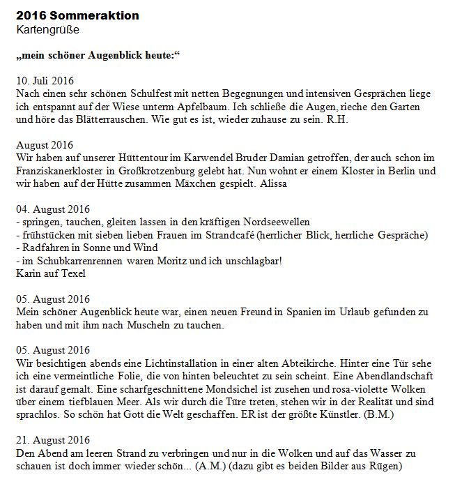 In diesem Sommer sammeln wir schöne Augenblicke aus den Ferien. Die beim Sommerfest ausgeteilten Postkarten kommen langsam zurück und erzählen von schönen Momenten in diesem Sommer. Hier können Sie die ersten Eindrücke nachlesen und sich mitfreuen. Gerne können Sie uns auch noch Ihre Erlebnisse in einem kleinen Gruß zuschicken und mit den anderen teilen (z.B. per Postkarte an das FBW oder per Mail direkt an michael@kreuzburg.de)!
