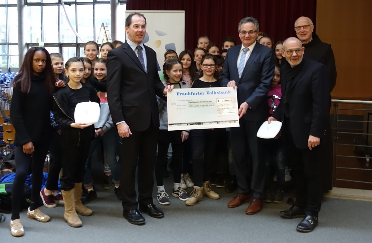 Im Rahmen des Jubiläumjahres überreichte der Leiter des Regionalmarktes Hanau der Frankfurter Volksbank, Robert Lang, an die Schule eine Spende in Höhe von 2.500 Euro. Die Schule wird diesen Betrag für das neu zu installierende W-Lan-Netz investieren. Damit wird die Ausstattung der Schule um einen weiteren Schritt verbessert.