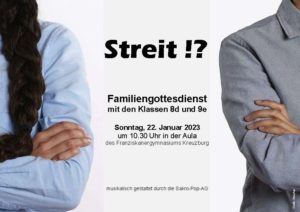 Am Sonntag, 22. Januar 2023 um 10.30 Uhr findet in der Aula unserer Schule ein Familiengottesdienst mit den Klassen 8d und 9e zum Thema „Streit“ statt.