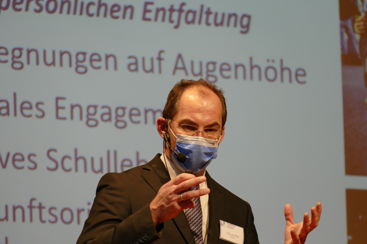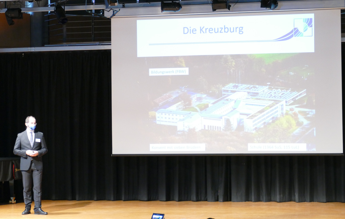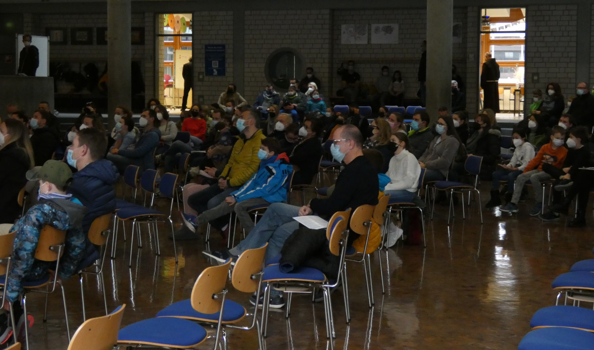 Einen Überblick über das Angebot des Gymnasiums gab Schulleiter Thomas Wolf in einem Vortrag über das christlich-franziskanische Schulprofil. Weitere Schwerpunkte seiner Ausführungen waren der Freie Lernbereich (FLB) als Besonderheit der Schule sowie die Ausstattung aller Schülerinnen und Schüler mit digitalen Endgeräten seit diesem Schuljahr. Der FLB startet in der Jahrgangsstufe 5 mit dem Fach Learn IT, in dem die Kinder vor allem das „Lernen lernen“ sollen, aber auch den Umgang mit Tablets, um diese im Fachunterricht nutzen zu können. In der Jahrgangsstufe 6 bietet der FLB den Schülerinnen und Schüler die Möglichkeit, über die Dauer eines Schulhalbjahres ein Gebiet ihres Interesses auszuwählen und auszuprobieren. Die Themen sind vielseitig und reichen von Outdoor-Abenteuern über Glitzerchemie zu Theaterprojekten. In den weiteren Jahrgangsstufen wechseln sich jeweils Pflichtthemen zur Persönlichkeitsentwicklung mit der Möglichkeit zur Wahl eigener fachlicher Schwerpunkte ab.